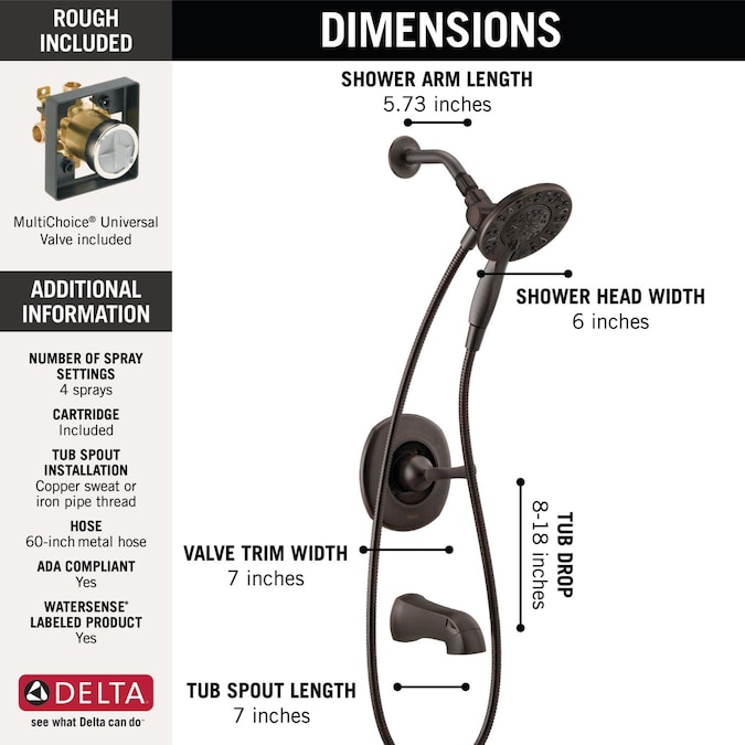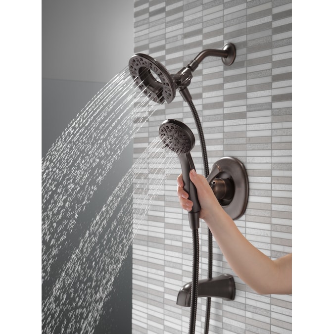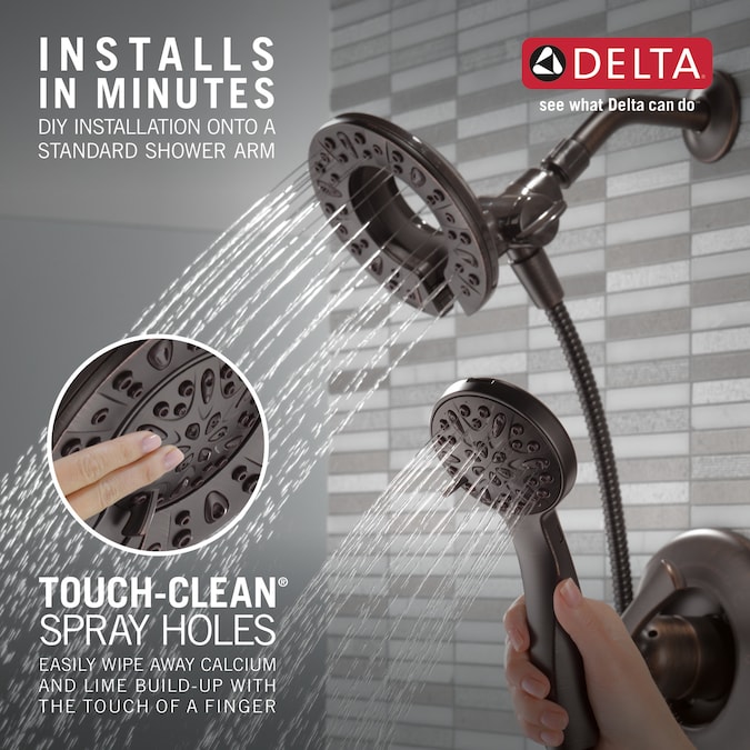 The Delta In2ition Two-in-One Shower features a detachable hand shower which can be used separately from or simultaneously with the shower head. This integrated dual-functionality gives you maximum flexibility without sacrificing warmth, as you can choose to have water streaming from the shower head only, the hand shower only or both the shower head and hand shower at once. While other products may gather unsightly mineral build-up over time, Delta soft rubber Touch-Clean spray holes allow any mineral residue to simply be wiped away for an instantly refreshed look – with no need for soaking or the aid of chemical cleaners. The pause setting gives you ample space for shaving, lathering and other shower tasks, then easily restarts the water with the temperature where you left off. This spray setting helps you conserve water, so you can worry less about depleting your supply of hot water – and you help the environment too. Delta pressure-balance valves use Monitor Technology to protect you and your family from sudden temperature changes. Delta WaterSense labeled faucets, showers and toilets use at least 20% less water than the industry standard—saving you money without compromising performance.