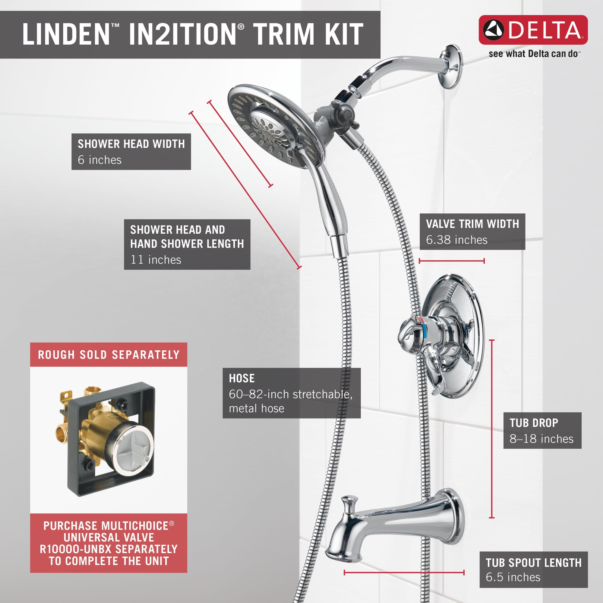 The Delta® In2ition® Two-in-One Shower features a detachable hand shower which can be used separately from or simultaneously with the shower head. This integrated dual-functionality gives you maximum flexibility without sacrificing warmth, as you can choose to have water streaming from the shower head only, the hand shower only or both the shower head and hand shower at once. With separate handles for volume and temperature control, this Delta tub/shower provides a more refined showering experience. Simply set the water at your preferred temperature and turn the shower on or off with the volume control handle – without interrupting your set temperature. Delta WaterSense labeled faucets, showers and toilets use at least 20% less water than the industry standard—saving you money without compromising performance.