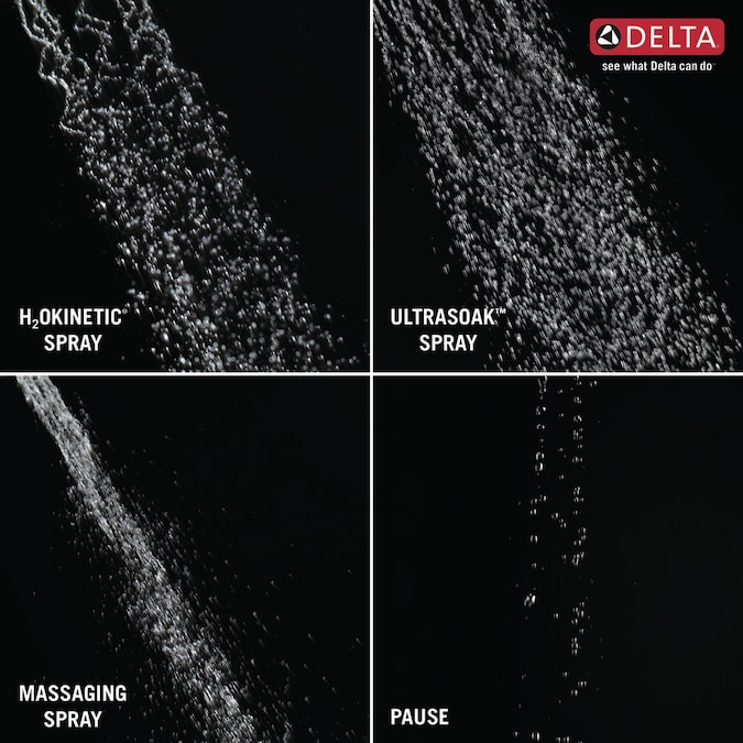 - Spray settings include: H2Okinetic® PowerDrench® spray, Massaging spray, H2Okinetic® UltraSoak™ spray, and Pause
