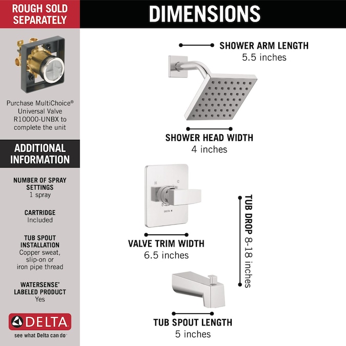 The Modern™ Bath Collection features European-inspired, streamlined looks to match the popular aesthetic in urban markets. Delta® showers with Monitor® pressure-balance valves are engineered to make sure you don’t experience a sudden and possibly unsafe change in water temperature as a result of running water elsewhere, such as using a dishwasher, flushing a toilet or running a washing machine. While other products may gather unsightly mineral buildup over time, Delta soft rubber Touch-Clean® spray holes allow any mineral residue to simply be wiped away for an instantly refreshed look — with no need for soaking or the aid of chemical cleaners. Delta WaterSense labeled showers use at least 20% less water than the industry standard — helping you save water without compromising performance. You can install with confidence, knowing that Delta showers are backed by our Lifetime Limited Warranty.