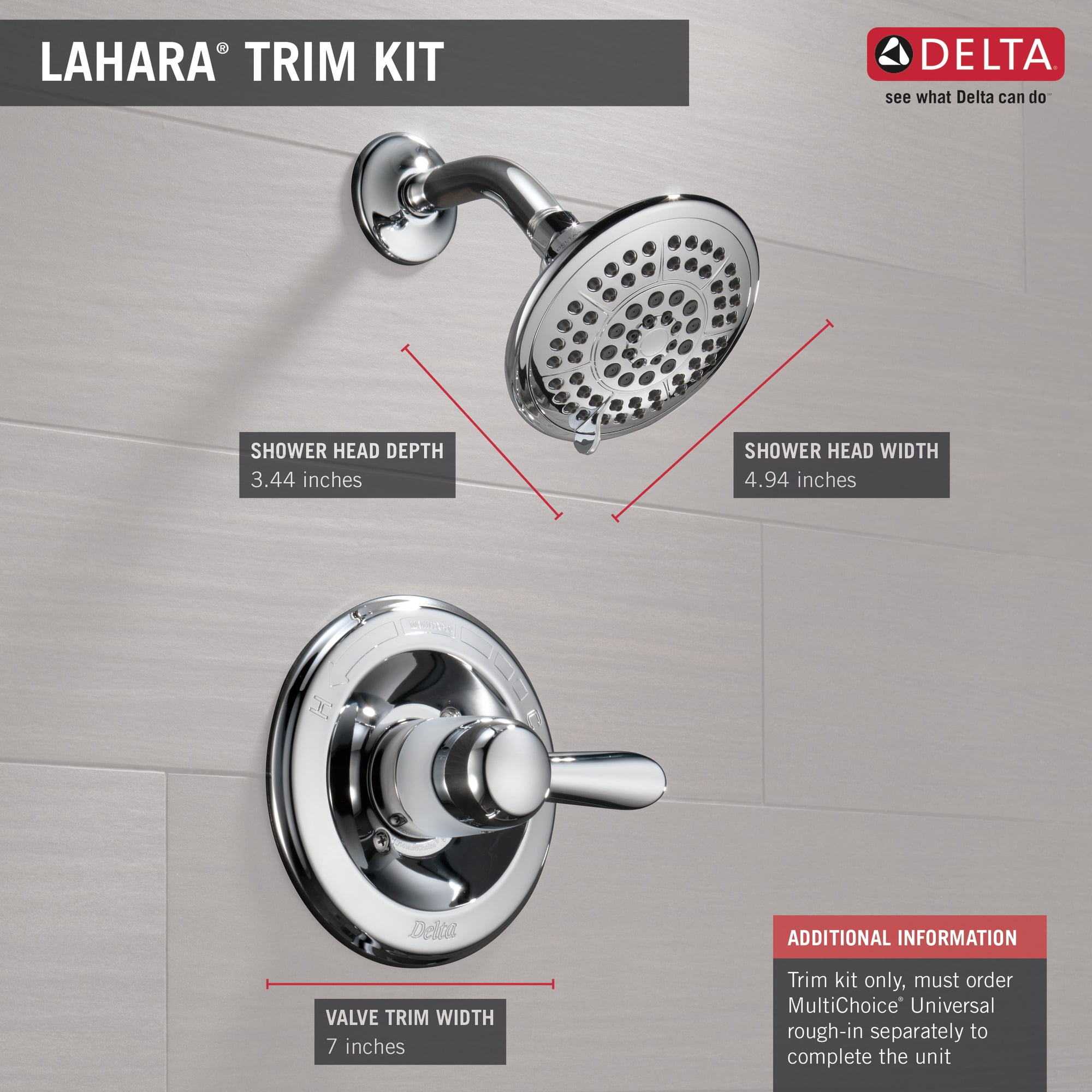Trim kit only, must order MultiChoice Universal rough-in separately to complete the unit Monitor pressure balance valve keeps water temperature within a safe +/-3 degrees F (+/-1.6degrees C), helping to protect you from sudden changes in hot or cold water pressure Spray settings: Pause, Full Body Spray, Full Spray w/Massage, Fast Massage, Soft Drench Spray Hand shower with the touch of a finger Single function operation Single lever handle for ease of temperature control Meets standards set by the Americans with Disabilities Act (ADA)