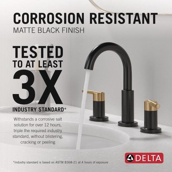 - CORROSION-RESISTANT FINISH: DeltaMatte Black faucet finishes are salt fog tested, meaning they withstand a corrosive, chemical solution for over 12 hours, triple the required industry standard, without blistering, cracking or peeling