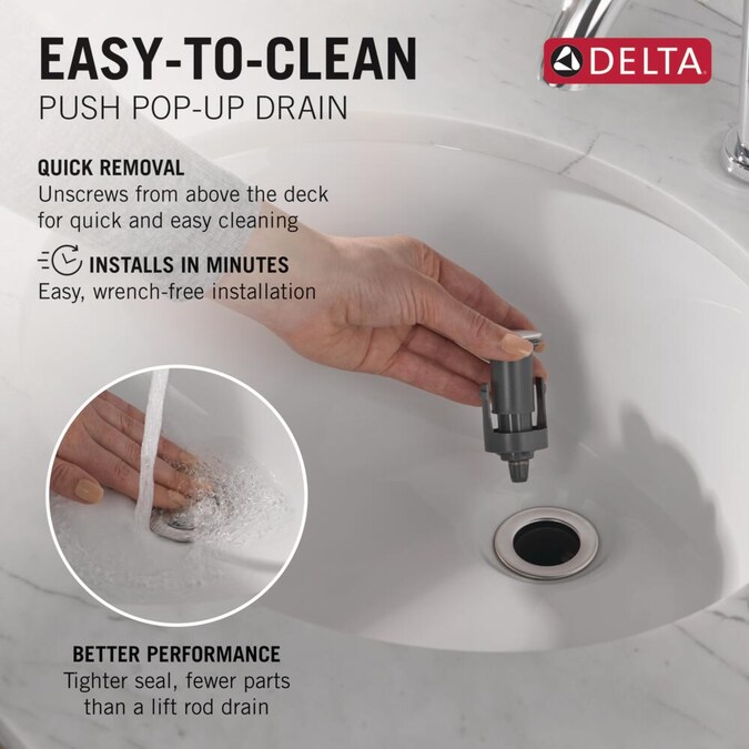• EASY-TO-CLEAN DRAIN: Push pop-up drain unscrews from above the deck for quick removal and easy cleaning of hair and other bathroom sink debris
