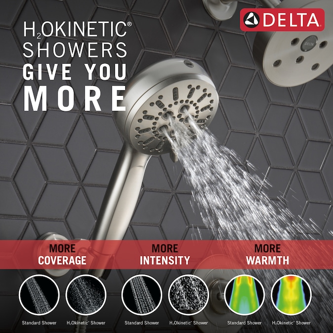 The Delta® ProClean™ Hand Shower cleans shower surfaces at least two times faster than standard sprays, powering off soap scum and shower messes. Perfect for an easy upgrade, the ProClean™ Hand Shower makes it easier to keep your shower and tile clean and reduce soap scum buildup with regular use. The focused, wide fan spray allows you to quickly clean hard-to-reach places without stepping foot in the shower. Delta® Lumicoat™ Finishes are guaranteed to resist water spots and mineral buildup and easily wipe clean without the need for cleaners or chemicals. The ultra-sleek surface repels liquids, resisting water spots and staying cleaner longer, so your faucet’s most commonly touched areas stay beautiful. Using advanced technology, H2Okinetic® showers sculpt water into a unique wave pattern, giving you 3X the coverage of a standard shower head and providing more coverage, more warmth and more intensity for a truly drenching shower experience. You can install with confidence, knowing Delta products are backed by our Lifetime Limited Warranty.