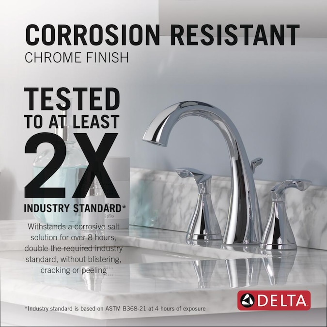 • CORROSION-RESISTANT FINISH: DeltaChrome bathroom faucet finish is intentionally engineered for durability and tested for corrosion resistance to at least 2 times industry standards