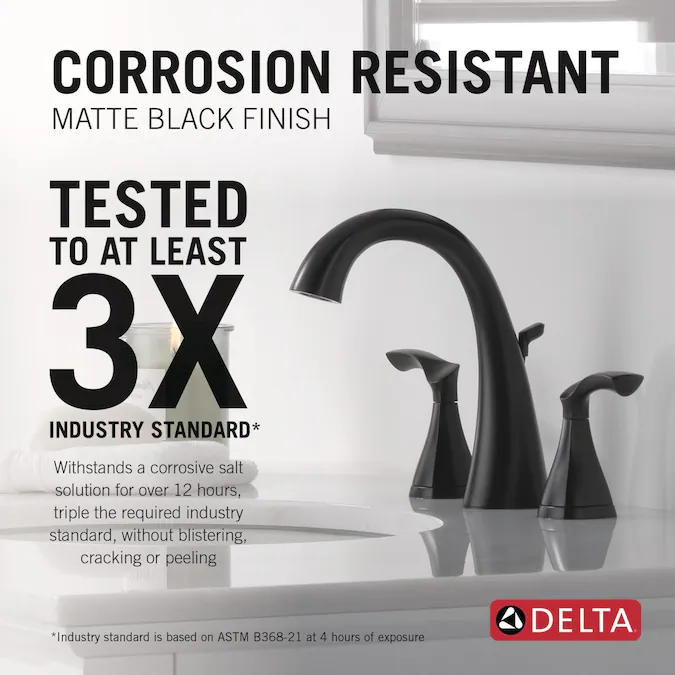 - CORROSION-RESISTANT FINISH: DeltaMatte Black faucet finishes are salt fog tested, meaning they withstand a corrosive, chemical solution for over 12 hours, triple the required industry standard, without blistering, cracking or peeling spout