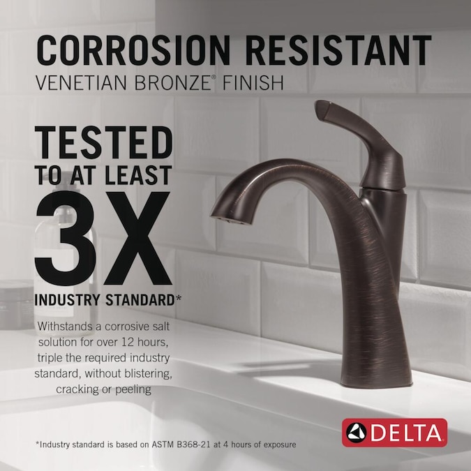 - CORROSION-RESISTANT FINISH: Delta® Venetian Bronze faucet finishes are salt fog tested, meaning they withstand a corrosive, chemical solution for over 12 hours, triple the required industry standard, without blistering, cracking or peeling
