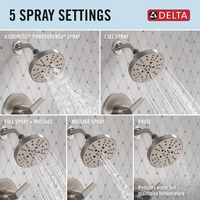 - Spray settings include: H2Okinetic® PowerDrench® Full Spray, Massage Spray, Full Spray + Massage, and Pause