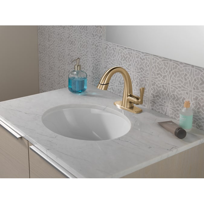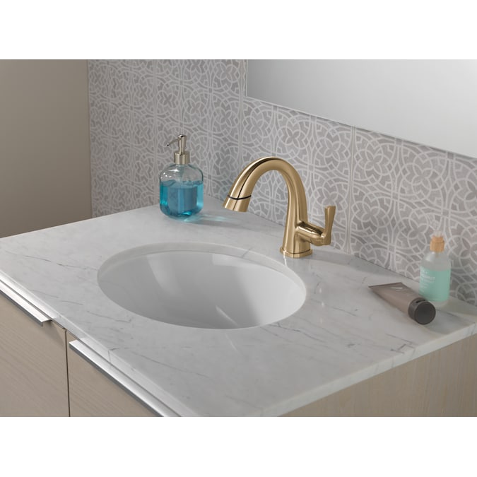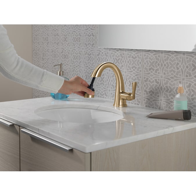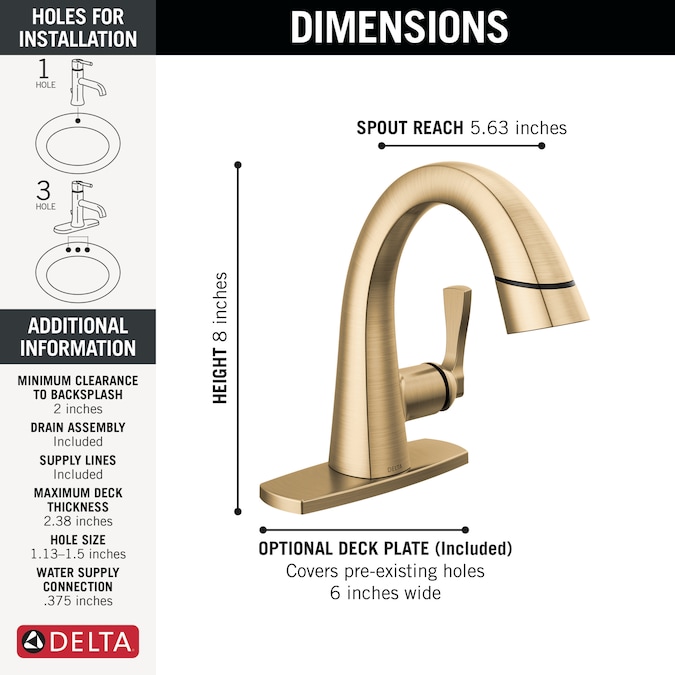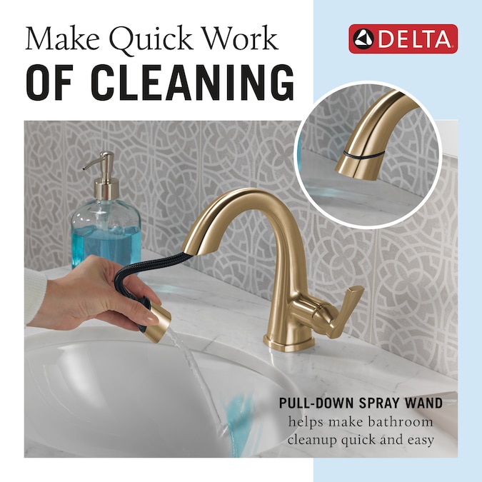 With subtly upturned spout and handles, the Stryke™ Bath Collection radiates confidence and composure with an assured stature and ascending contours. The pull-down spray wand features Delta® MagnaTite Docking which uses a powerful integrated magnet to pull your faucet spray wand precisely into place and hold it there so it stays docked when not in use. The Worry-Free Drain Catch is a simple solution to the common problem of pills, jewelry or other valuables washing down the drain. Delta® Lumicoat™ Finishes provide an ultra-sleek surface that repels liquids, resisting water spots and staying cleaner longer, so your faucet stays beautiful. Delta® faucets with Diamond Seal® Technology perform like new for life with a patented design that reduces leak points, is less hassle to install and lasts twice as long as the industry standard. Delta WaterSense® labeled faucets use at least 20% less water than the industry standard — helping you save water without compromising performance. You can install with confidence, knowing that Delta faucets are backed by our Lifetime Limited Warranty.