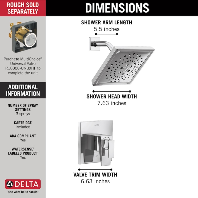 The prismatic faceting of the Trillian™ Bath Collection is an evolution of modern style that creates an edgy look which catches the light as well as the eye. With separate handles for volume and temperature control, this Delta tub/shower provides a more refined showering experience. Simply set the water at your preferred temperature and turn the shower on or off with the volume control handle – without interrupting your set temperature. The pause setting gives you ample space for shaving, lathering and other shower tasks, then easily restarts the water with the temperature where you left off. This spray setting helps you conserve water, so you can worry less about depleting your supply of hot water – and you help the environment too. Delta® pressure-balance valves use Monitor® Technology to protect you and your family from sudden temperature changes. Delta® Lumicoat™ Finishes easily wipe clean without the need for cleaners or chemicals and are guaranteed to resist mineral buildup and hard water stains. The ultra-sleek surface repels liquids, resisting water spots and staying cleaner longer, so your faucet stays beautiful. Delta WaterSense labeled faucets, showers and toilets use at least 20% less water than the industry standard—saving you money without compromising performance. You can install with confidence, knowing that Delta faucets are backed by our Lifetime Limited Warranty.