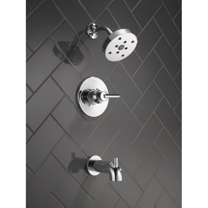 Reflect your personal style with this Delta bathtub and shower faucet trim kit combination from the Trinsic collection. The chrome finish delivers a brilliant shine and the sleek, modern design adds a new dimension to your shower and bath area. By meeting WaterSense criteria, this faucet conserves water with each use without compromising performance. The H2Okinetic single-function showerhead flows at 2.0 GPM, sculpting the water into a unique wave pattern while saving water at the same time. The single-handle lever is easy to use, allowing you to adjust water temperature with one simple movement. This faucet maintains a balanced pressure of hot and cold water, even when a toilet is flushed or dishwasher starts, protecting you and your family from harmful fluctuations. Enjoy the benefits and beautiful sheen this faucet set adds to your bathroom.