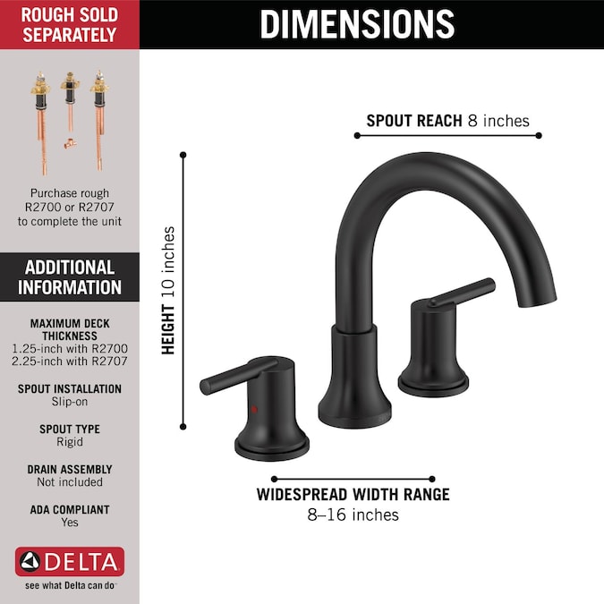 Complete your bath with a beautifully designed Delta roman tub faucet, meticulously crafted to turn heads and enhance your experience. Matte Black makes a statement in your space, cultivating a sophisticated air and coordinating flawlessly with most other fixtures and accents. With bright tones, Matte Black is undeniably modern with a strong contrast, but it can complement traditional or transitional spaces just as well when paired against warm neutrals for a rustic feel akin to cast iron. You can install with confidence, knowing that Delta faucets are backed by our Lifetime Limited Warranty.