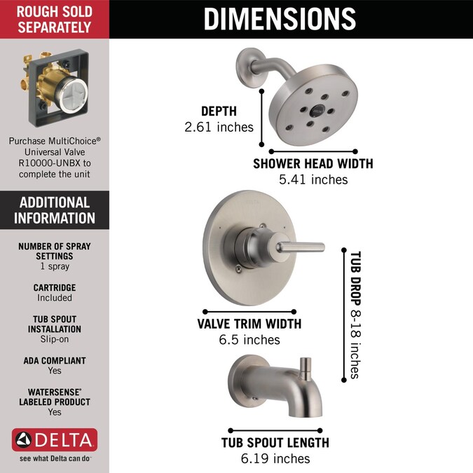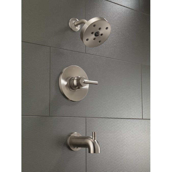 Inspired by the sleek elegance of modern European design, the Trinsic Bath Collection completes the look of any contemporary bath, from classic to rustic. This Brilliance Stainless finish has subtle, warm undertones which make it an excellent match with brushed nickel or stainless steel and is extremely versatile, complementing nearly any look, be it traditional, transitional or contemporary. Delta H2Okinetic Showers look different because they are different. Using advanced technology, H2Okinetic shower heads sculpt water into a unique wave pattern, giving you 3X the coverage of a standard shower head. The end result is a shower that provides more coverage, more warmth and more intensity for a truly drenching shower experience. So go ahead and indulge, because now you can enjoy the feeling of more water without using more water. Delta pressure-balance shower valves use Monitor Technology to protect you and your family from sudden water temperature changes due to flushing toilets or running appliances. Delta WaterSense labeled sink faucets, shower faucets and toilets use at least 20% less water than the industry standard—saving you money without compromising performance. This unit does not include the required Delta MultiChoice Universal Valve and must be purchased separately (recommended rough-in model R10000-UNBX). You can install with confidence, knowing that Delta shower faucets are backed by our Lifetime Limited Warranty.