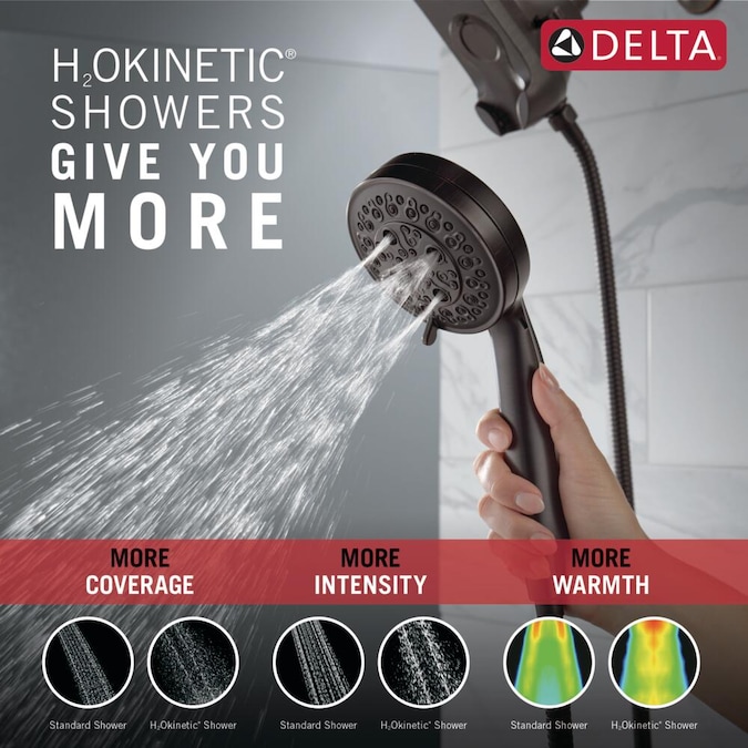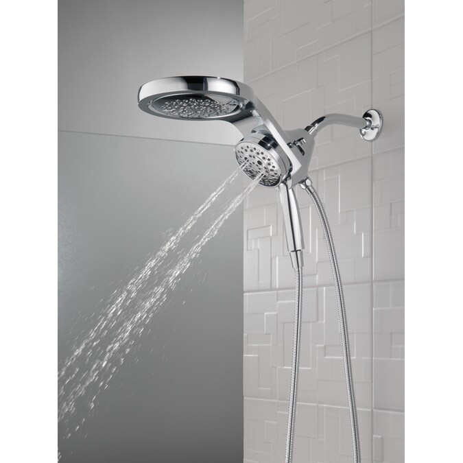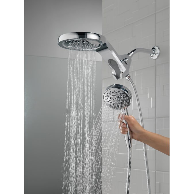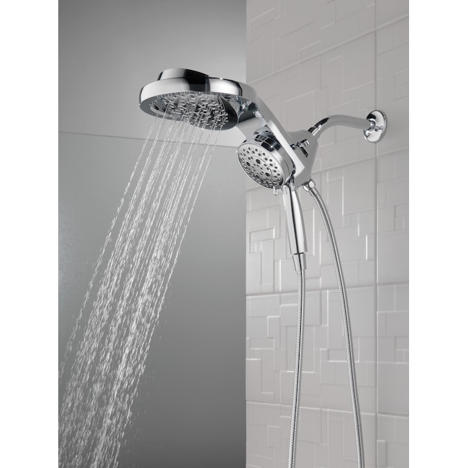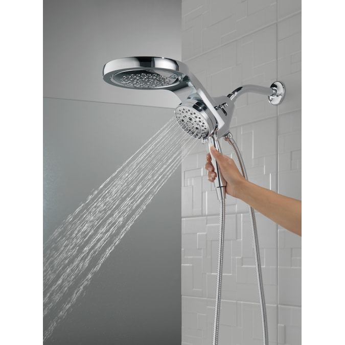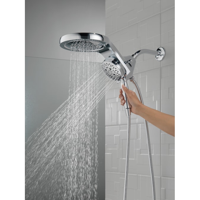 A Delta® HydroRain® H2Okinetic® Two-in-One Shower Head with hand shower completely transforms your shower with dual shower head functionality, featuring an integrated raincan and hand shower. The power of the raincan and hand shower together creates an immersive, spa-like showering experience that you can install in minutes to a standard shower arm, without altering the plumbing behind the wall. The integrated hand shower stays put every time you dock thanks to MagnaTite® Docking and provides maximum flexibility and control when you need it, while the H2Okinetic PowerDrench® Spray feels like more water, warmth and intensity without using more water. Don’t just take a shower, transform it, with a Delta HydroRain Shower Head. While other products may gather unsightly mineral build-up over time, Delta soft rubber Touch-Clean® spray holes allow any mineral residue to simply be wiped away for an instantly refreshed look – with no need for soaking or the aid of chemical cleaners. The pause setting gives you ample space for shaving, lathering and other shower tasks, without worrying about overspray or water waste. This spray setting helps you conserve water, so you can worry less about depleting your supply of hot water – and you help the environment too.