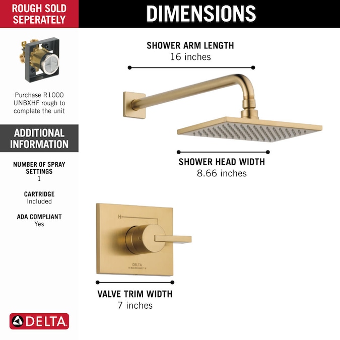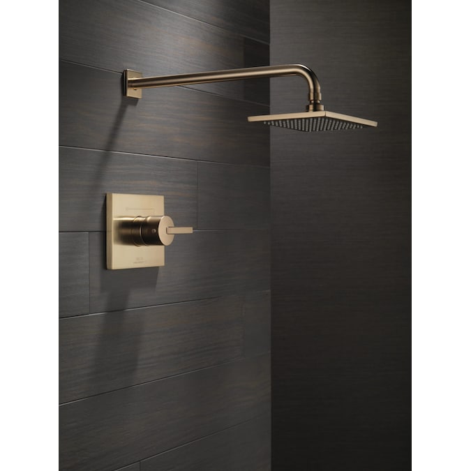 Inspired by the slim lines and graceful arc of a ribbon, the Vero bath collection offers a high-end, modern look. Designed to look like new for life, Brilliance finishes are developed using a proprietary process that creates a durable, long-lasting finish that is guaranteed not to corrode, tarnish or discolor. While other products may gather unsightly mineral build-up over time, Delta soft rubber Touch-Clean spray holes allow any mineral residue to simply be wiped away for an instantly refreshed look – with no need for soaking or the aid of chemical cleaners. Delta pressure-balance valves use Monitor Technology to protect you and your family from sudden temperature changes. Take the chill out of contemporary with the eloquent warmth of Champagne Bronze™ in your bath. This vibrant, gold finish provides a vivid splash of contrast to your space for a look that