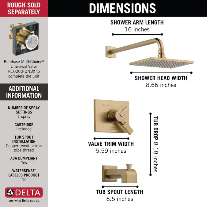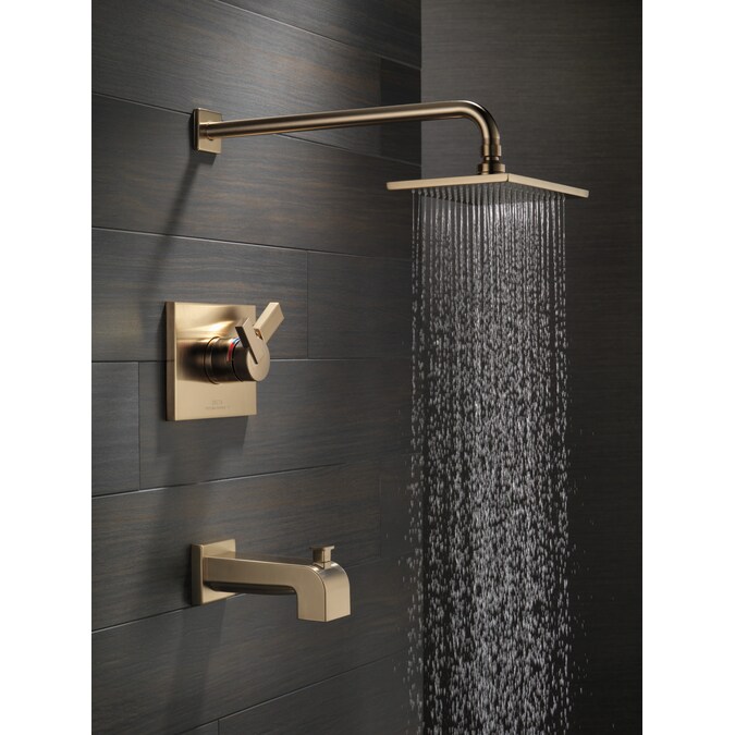 With separate handles for volume and temperature control, this Delta tub/shower provides a more refined showering experience. Simply set the water at your preferred temperature and turn the shower on or off with the volume control handle – without interrupting your set temperature. Designed to look like new for life, Brilliance® finishes are developed using a proprietary process that creates a durable, long-lasting finish that is guaranteed not to corrode, tarnish or discolor. While other products may gather unsightly mineral build-up over time, Delta soft rubber Touch-Clean® spray holes allow any mineral residue to simply be wiped away for an instantly refreshed look – with no need for soaking or the aid of chemical cleaners. Delta® pressure-balance valves use Monitor® Technology to protect you and your family from sudden temperature changes. Take the chill out of contemporary with the eloquent warmth of Champagne Bronze™ in your bath. This vibrant, gold finish provides a vivid splash of contrast to your space for a look that’s simultaneously modern and nimble, able to pair elegantly with traditional, transitional and contemporary décor.