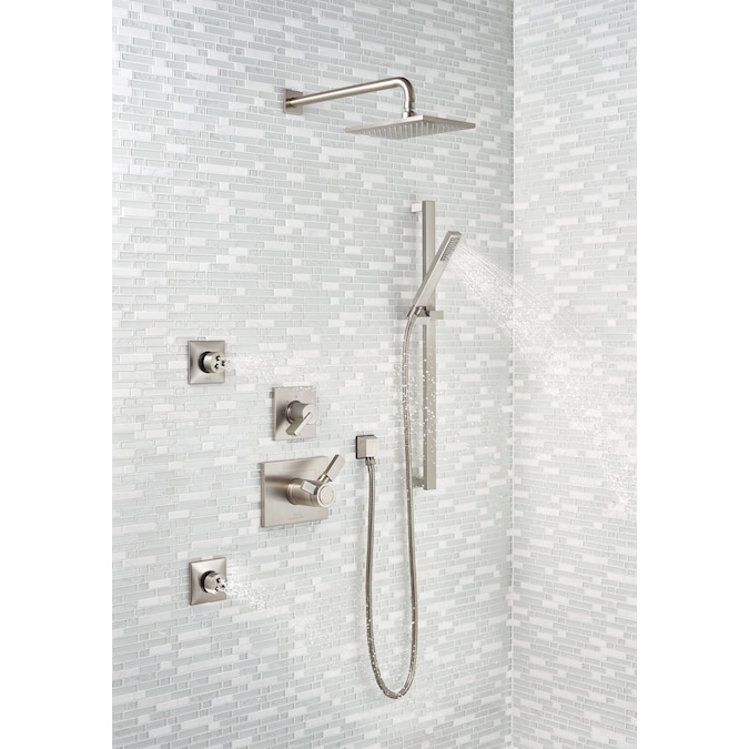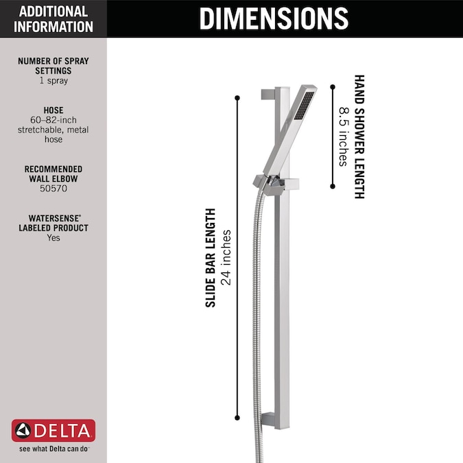 - Includes 60-in – 82-in stretchable metal hose for extended reach within the shower