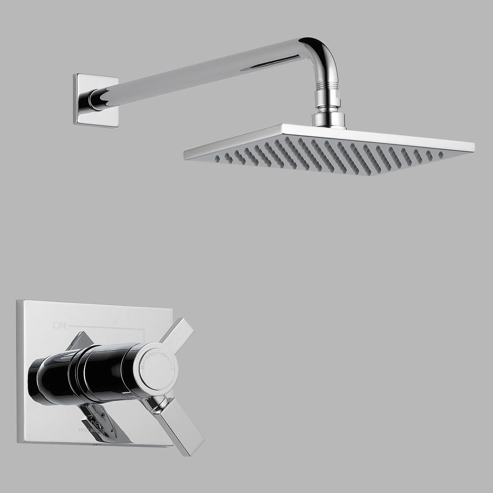 Features: Control volume and water temperature independently with two separate handles for more refined control of your shower experience TempAssure thermostatic valve keeps water temperature within a safe +/-3degrees F (+/-1.6degrees C), helping to protect you from sudden changes in hot or cold water pressure Spray settings include: Full Body spray Full body spray provides a steady, full-coverage spray perfect for every shower need, from rinsing shampoo from hair to relaxing tired muscles Soft, rubber Touch-Clean® spray holes allow you to easily wipe away calcium and lime build-up from the spray face of your shower head and hand shower with the touch of a finger Faucet and Finish Lifetime Limited Warranty Specifications: Handle: Single Handle Lever Valve Type: Dual-function thermostatic cartridge Overall Depth: 18.13″ Overall Width: 8.66″ Overall Height: 7.59″ Flow Rate: 2.50 GPM CEC Certified: No WaterSense: No