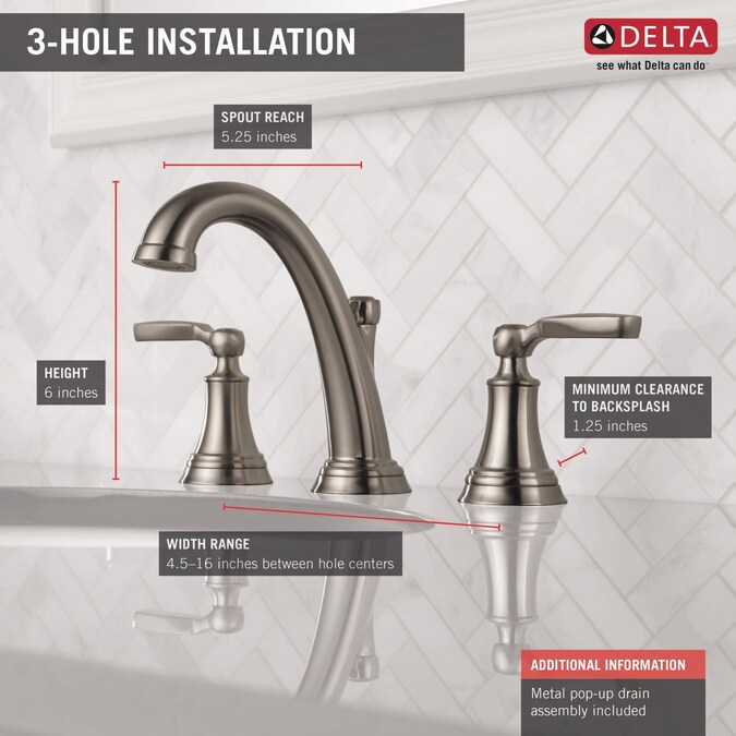 The Woodhurst™ Bath Collection’s refined style lends an alluring charm to your bath, while the button-cap detailing confers a classic familiarity. You can install with confidence, knowing that Delta® faucets are backed by our Lifetime Limited Warranty. Delta WaterSense® labeled faucets and showers use at least 20% less water than the industry standard—saving you money without compromising performance.