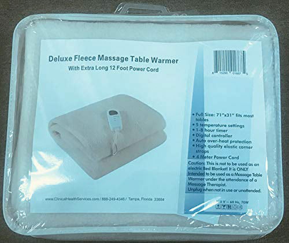 Full Size 31″ x 71″ Fleece Massage Table Warmer, 12 Foot Power Cord Extra Long 12 Foot Power Cord, helps you reach your massage table even if the outlet is far away! 5 adjustable heat settings, 4 timer settings, Auto over-heat protection. This is a table warmer, NOTE it DOES NOT GET HOT! Maximum Temperature is about 88 degrees F Comfortable fleece top with elastic corner straps to prevent slipping For Supervised Profession Massage Therapist Use Only! Unplug when not in use or unattended. Caution: Do not use as a Bed Sleeping blanket warmer.