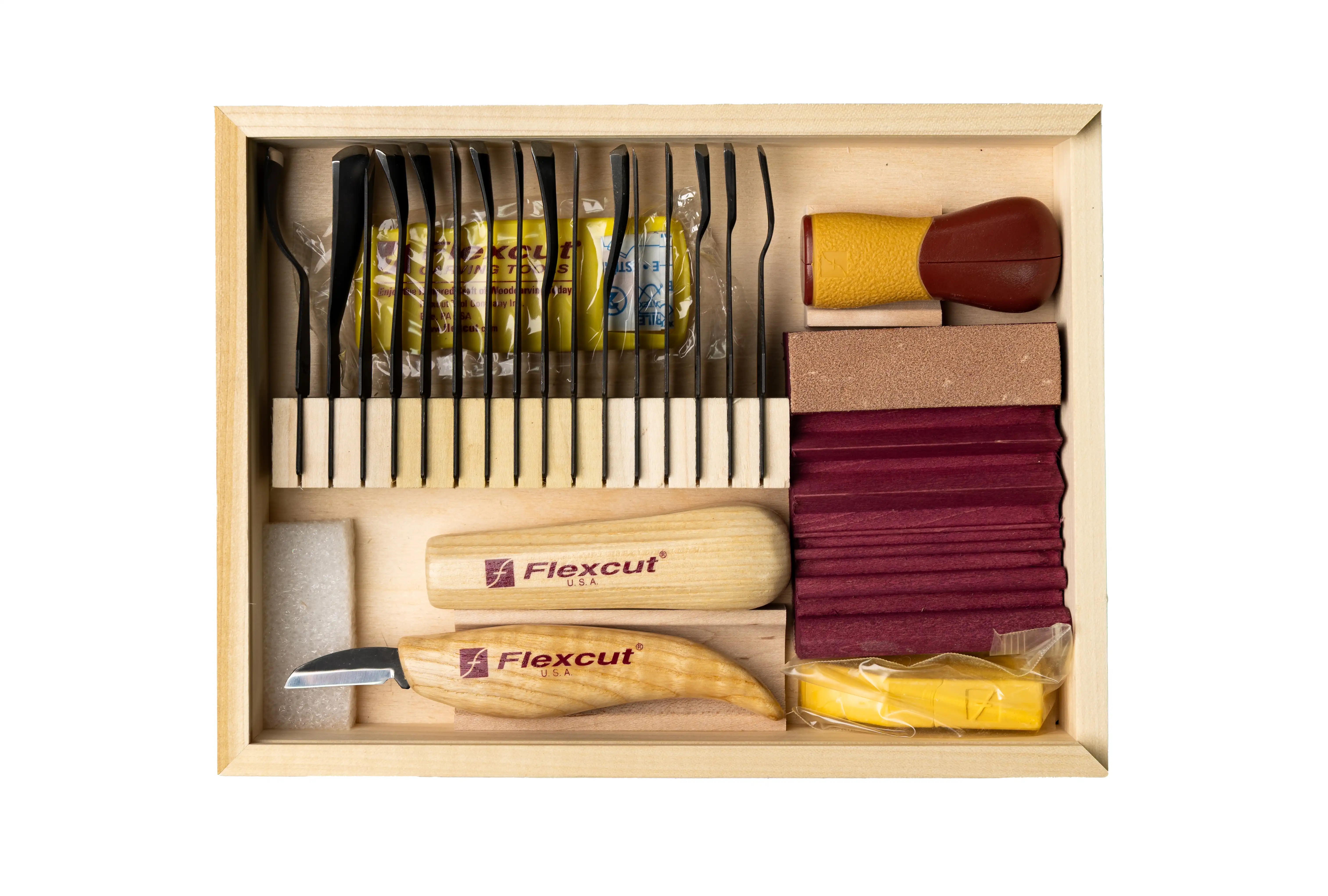 20-Piece Carving Starter SetKit contains: SK100 ABS quick connect handle, KN12 cutting knife, SK103 quick connect power handle, Flexcut SlipStrop and compound, 16 carving tools, wood storage box, and DVD version of Relief Carving in A Different Light. Starter carving set is Flexcut’s most complete carving set all-in-one box. Blade profiles include: 5/8 single bevel chisel, 9/16 double bevel chisel, No. 2 – 1/4 sweep, No. 2 – 7/8 sweep, No. 3 – 1/8 sweep, No. 6 – 1/2 sweep, No. 8 – 1/4 sweep, No. 8 – 3/8 sweep, No. 8 – 11/16 sweep, No. 9 – 9/16 sweep, No. 11 – 1/16 sweep, No. 11X – 3/16 thumbnail gouge, No. 11X – 1/2 thumbnail gouge, 45 deg. 5/23 V parting tool, 70 deg. 3/8 V parting tool, 7/8 back bent gouge. No. SK108: Pieces In Set: 20 pcs, Pkg Qty: 1, Package Type: Box