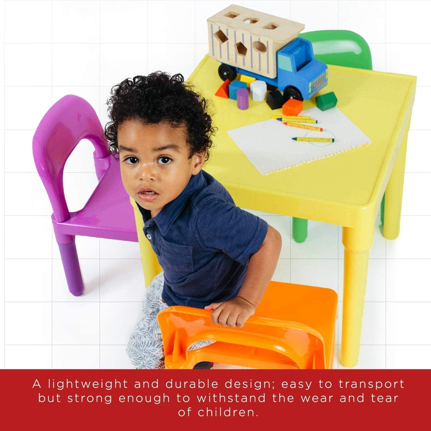 Durable, water-resistant plastic construction that is built to withstand wear and tear from children ages 3 and up. Easy-to-clean surface that won’t leave marks on walls or floors, making it a breeze to maintain. Fast and tool-free assembly, allowing you to set up the table and chairs in a snap. Space-saving design that can be quickly disassembled for easy storage, perfect for playrooms, classrooms, and kids’ rooms. Vibrant color scheme with orange, green, blue, and purple chairs, and a yellow table, creating a fun and engaging environment for your little ones. Dimensions: table – 20 x 20 x 17 inches, chairs – 12 x 11 x 18 inches, suitable for a variety of settings, from classrooms to daycares. BPA-free plastic construction ensures a safe and non-toxic play area for your children.