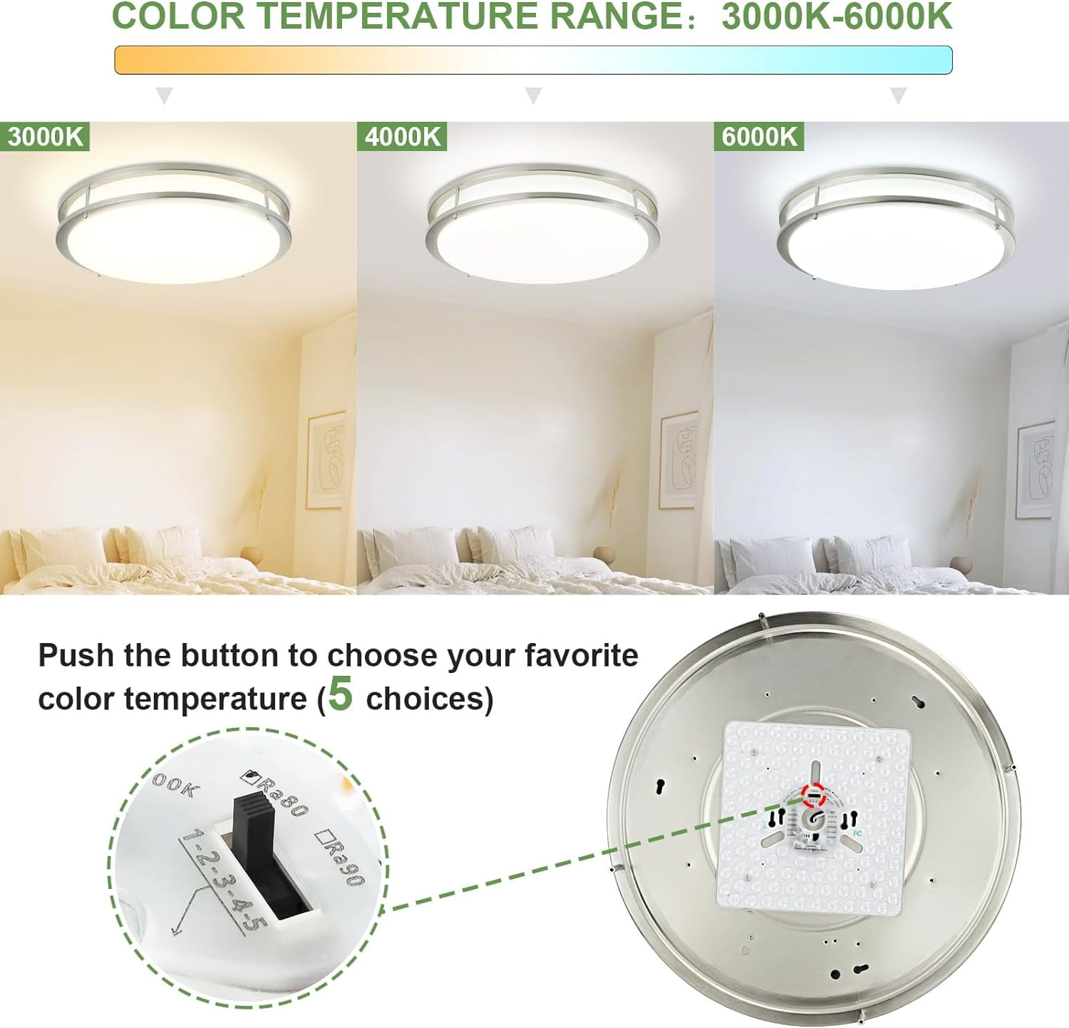 Why choose US Focus on LED Lighting over 12 years, owned factory, professional R&D and support team High Quality performance Super Bright but Energy Saving High Color Reflection, reflect real color and Eye-caring Quick Response Customer Service Featuring advanced technology, energy efficiency, and eye protection, this flush mount ceiling light is ideal for various spaces, including living rooms, bedrooms, entrances, hallways, and study rooms. Super Bright and Dimmable: This ceiling light offers three color temperature options: cool light, natural light, and warm light(3000K-6000K), and smooth dimming from 10% to 100% with remote control. It’s an excellent, high cost-performance LED ceiling light that directly replaces old fixtures. (Note: Not wireless, not battery operated, no motion sensor.) Energy Saving: Utilizing the new generation of LED chips and technology, this close to ceiling light produces 4080 lumens, equivalent to a 350W halogen lamp. It saves up to 90% in energy costs, significantly reducing your electricity bills. Eye Protection: The flush mount LED ceiling light boasts 85+ high color rendering index (CRI), accurately reflecting real-life colors and making it easy to distinguish various objects. The uniform light distribution without flickering protects your eyes from harsh and glaring light. Wide Application: Designed with double metal frame, this ceiling light is sturdy, durable, and resistant to deformation. Its unique yet simple and fashionable appearance adds style to any room, making it perfect for living rooms, bedrooms, entrances, hallways, study rooms, and more. Customer Service: We offer 12 months quality assurance and 30-day refund policy for quality issues. If you are not satisfied with our product, please feel free to contact us.