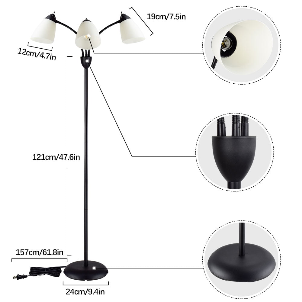 ⭐Why choose US Focus on LED Lighting over 12 years, owned factory, professional R&D and support team High Quality performance Super Bright but Energy Saving High Color Reflection, reflect real color and Eye-caring Quick Response Customer Service Home Decor: Simple and beautiful, this black floor lamp can be utilized practically anywhere in your indoor space. Suit for reading and daily use, this LED standing lamp includes 3 lights with white shades, each with a power max of 60W. Adjustable Gooseneck Design: The gooseneck shape design and adjustable head make it a versatile lighting solution. The lamp features 3 omnidirectional light fixtures that can adjust 360°, allowing you to direct light to all corners of your room or focus on a specific area. Ideal for tasks such as reading or working, this floor lamp is perfect for multiple spaces. On-Off Rotary Switch on Each Head: Each head has an on-off rotary switch, enabling you to control the light output and create the ideal lighting solution for your decor. Bulbs Requirement: The lamp accommodates E26 socket bulbs (60W max). You can choose your desired brightness level to meet different lighting needs. Compared to traditional bulbs, LED bulbs can save up to 80% energy and last for years without replacement.(Please Note: Bulbs NOT included) Simple Structure and Easy to Install: The lamp’s round-shaped base ensures stability and is not easy to fall over. The plastic material of the shades promises durability and safety, unlike glass versions. The lamp has a simple structure, and all necessary components are included for easy and quick assembly. Customer Service: We offer 12 months assurance and 30-day refund for quality issues. If you are not satisfied with our product, please feel free to contact us.