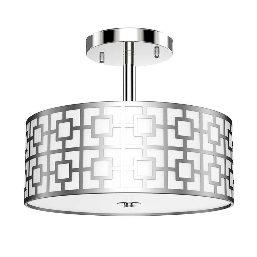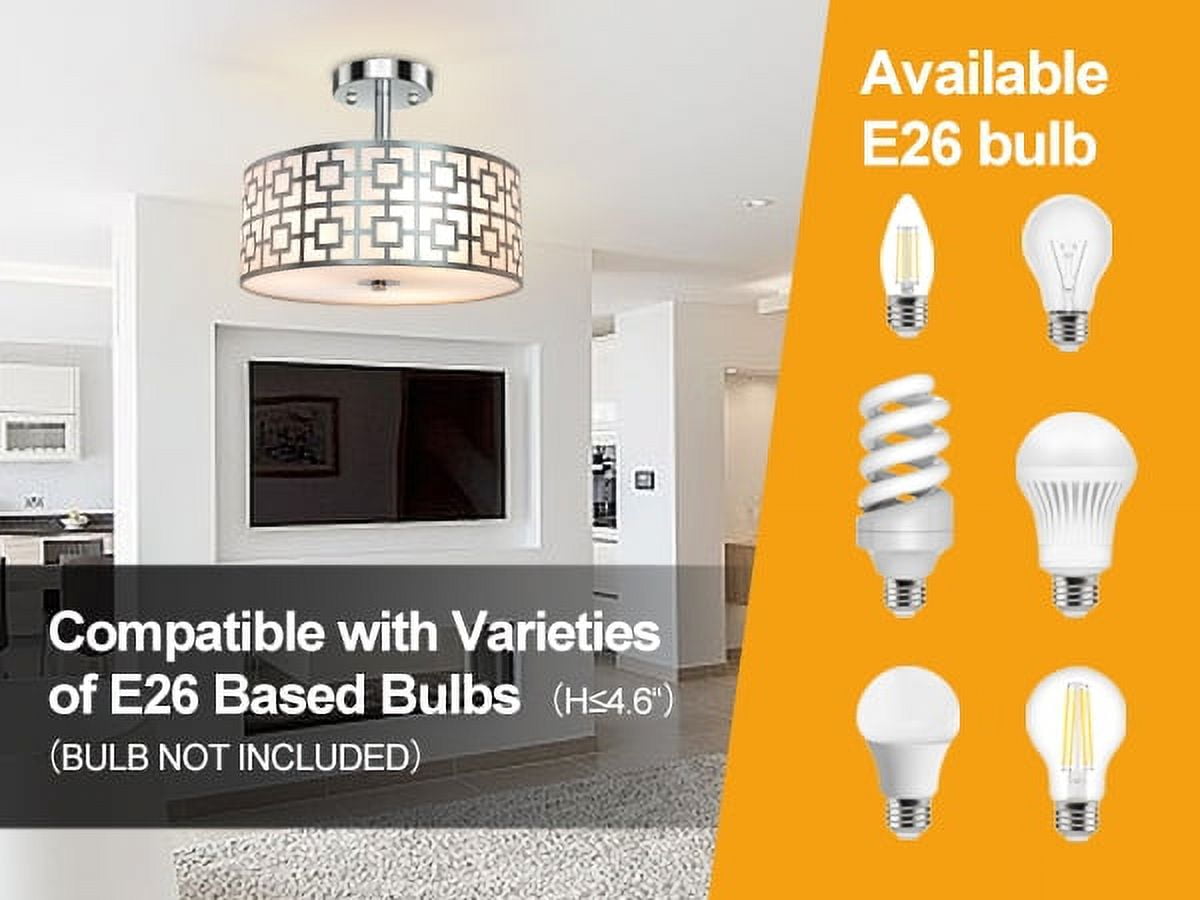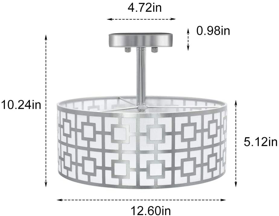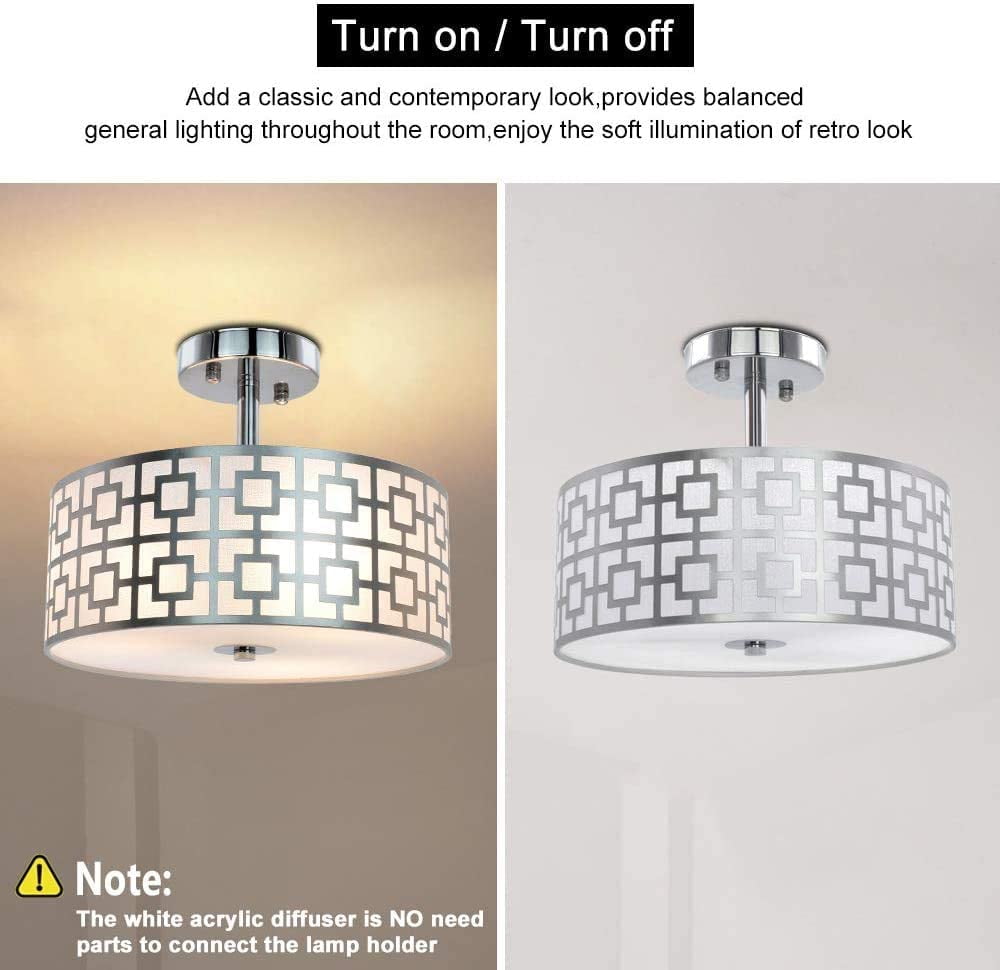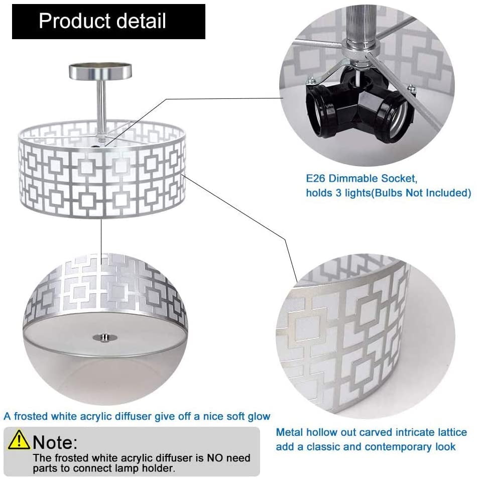 Elegant and classic design with a carved intricate lattice shade, complemented by a white fabric shade and a frosted white acrylic diffuser, blending classic exquisiteness with modern boldness Brushed chrome finish adds a delightful dimensional aspect, bringing your ceiling to life Compatible with dimmer switches, this flush mount ceiling light uses US standard E26 bulb socket (bulb not included) Offers a bright and soft glow with three E26 lamps, each supporting up to 60 watts max (bulbs not included) Ideal for homes with low or mid-height ceilings, perfect for various rooms, hallways, foyers, or even walk-in closets Illuminates spaces in a traditionally modern style, adding elegance and charm Comes with a 12-month warranty and friendly customer service (Note: The frosted white acrylic diffuser does not require parts to connect the lamp holder)
