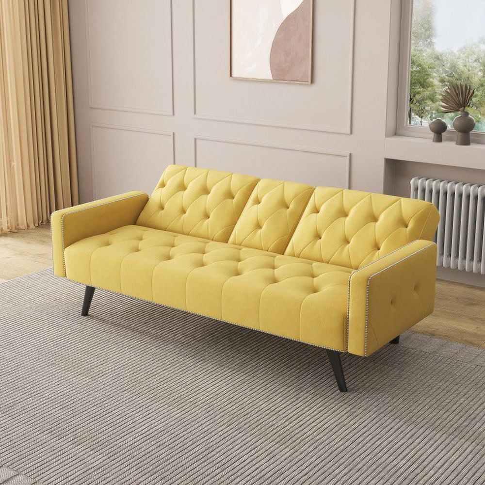 Derzers Upholstered Velvet Fabric Futon Sofa, Yellow Product Type: Modern Sofa Couch Material: Velvet Product Size (L*W*H): 72” x 25” x 31”H Weight: 74 lbs Adjustable Backrest: Features 3 adjustable positions for personalized comfort, allowing you to sit or lie down with ease Sturdy Construction: Built with a strong wood frame wrapped in supportive foam and durable velvet fabric, supporting up to 500 pounds Comfortable Seating: Seat cushion filled with high elastic foam and velvet fabric for optimal support and quick recovery Easy Assembly: All parts can be assembled in just a few minutes; installation instructions are included Versatile Design: Complements any home decor style, making it suitable for apartments, studios, living rooms, and bedrooms