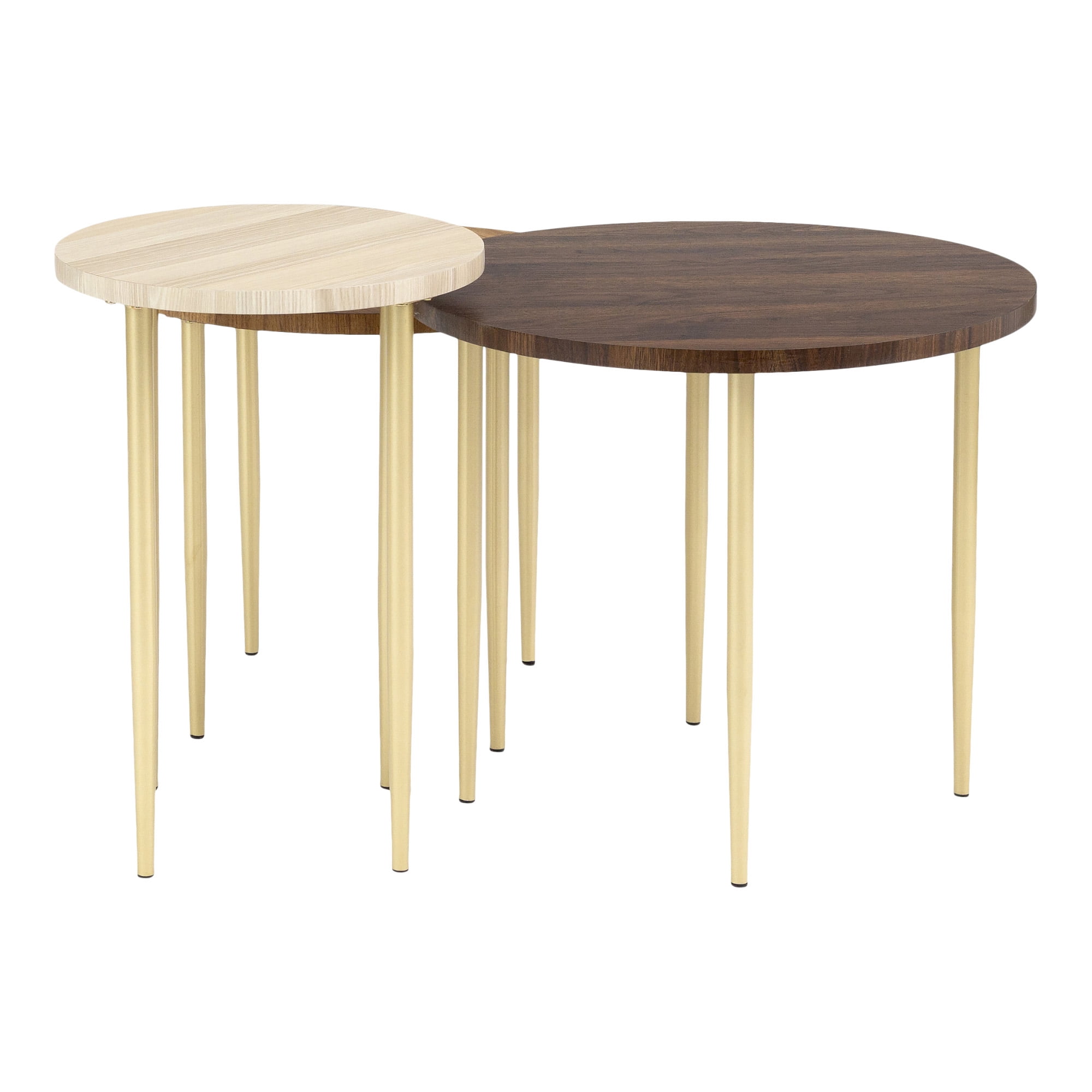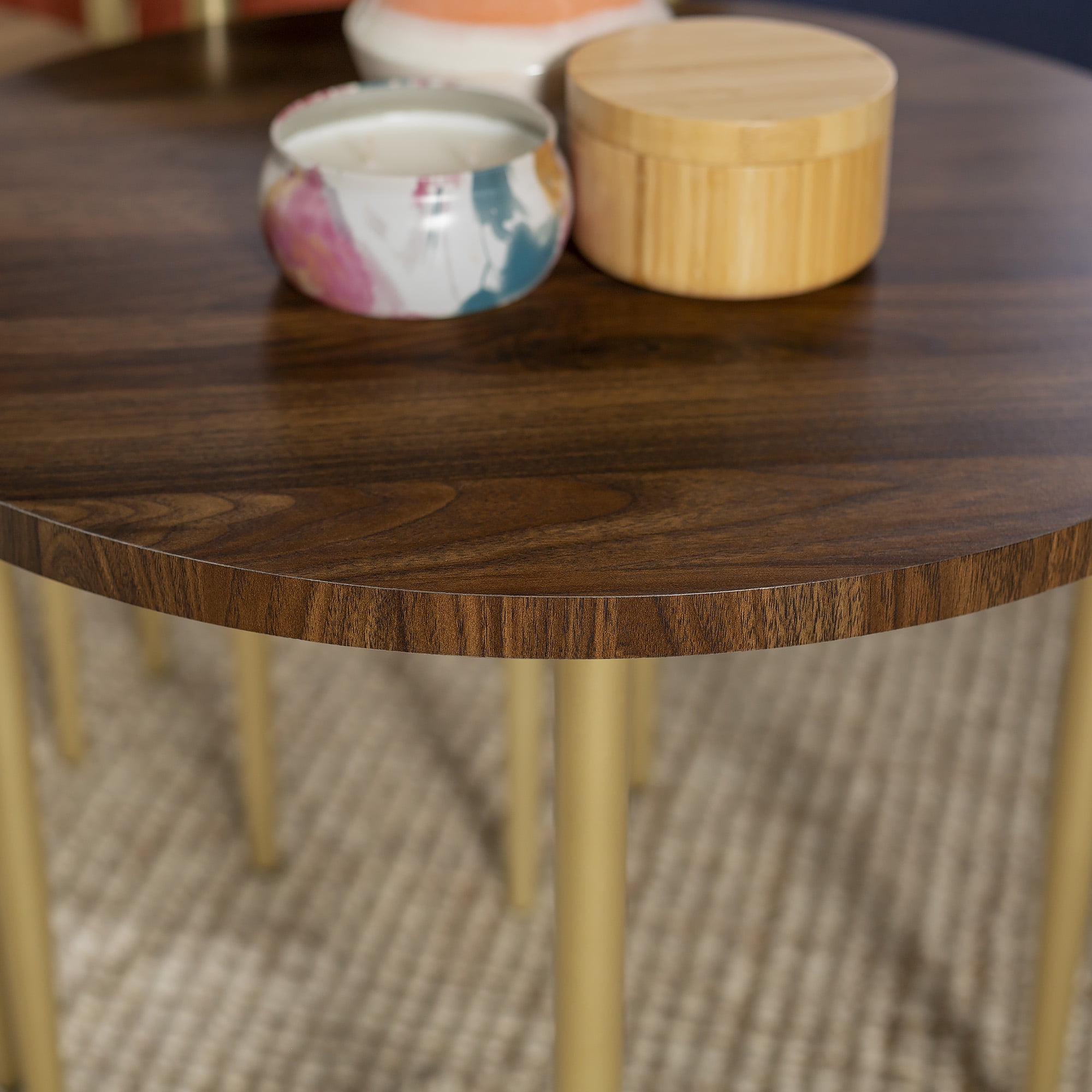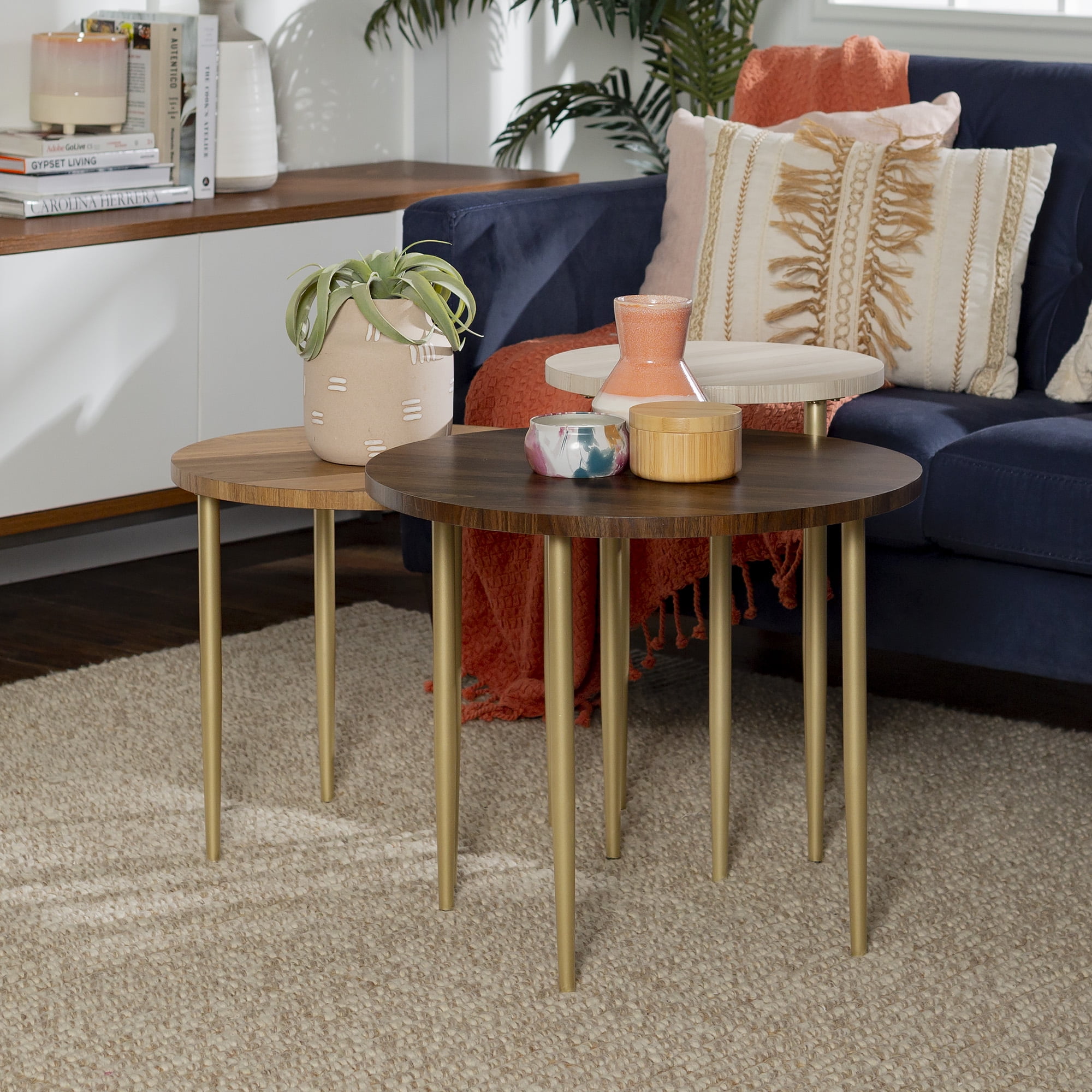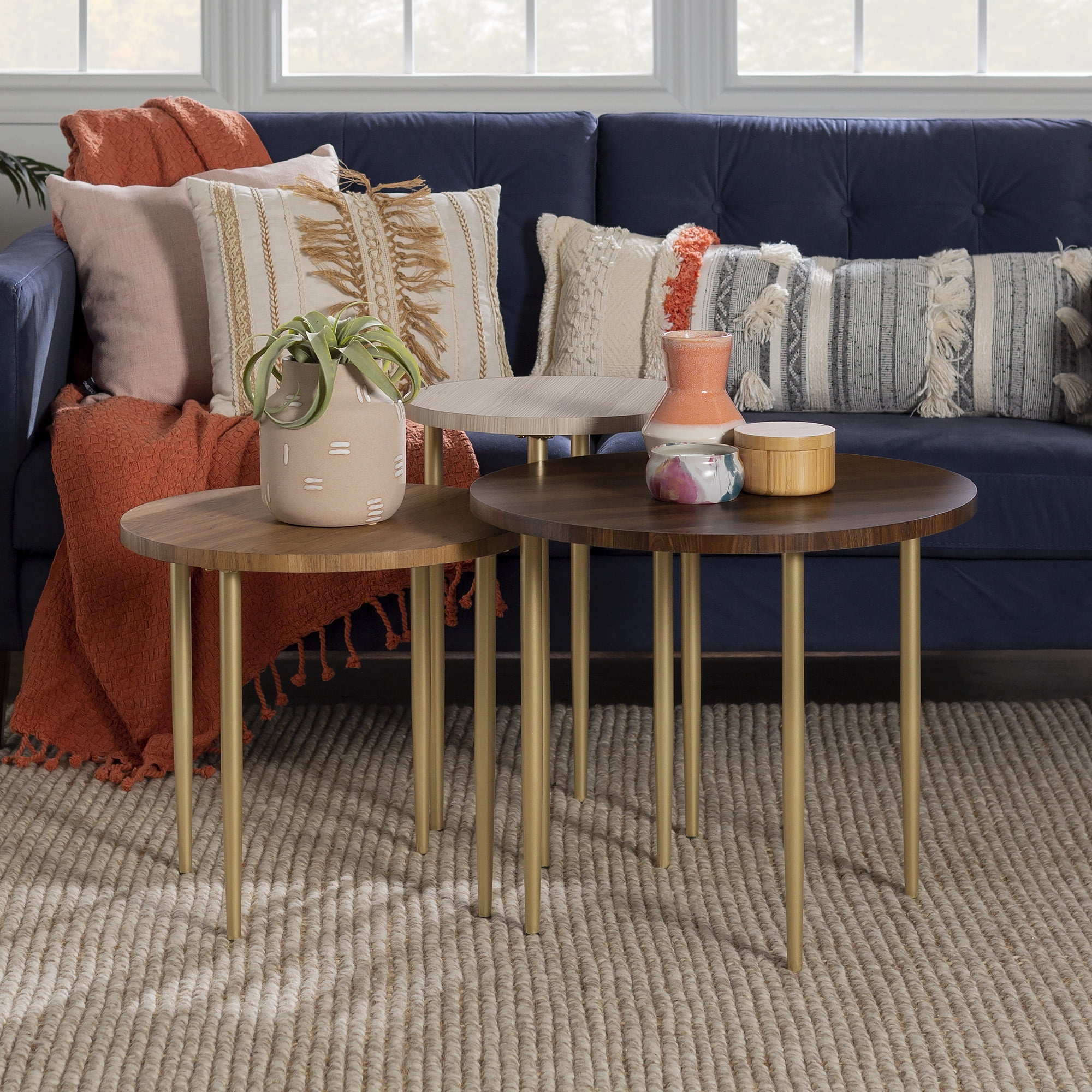 Desert Fields Camelia 3-Piece Nesting Coffee Table Set, Dark Walnut: Set of 3 coordinating nesting tables Can be used together or separately Protective caps on tapered metal legs help keep your floors safe from scratches, scuffs, or snags Trendy design features white poplar, dark walnut, and English oak brown-tone tops with gold finish legs Easy to assemble Tall table dimensions: 15.5″ D x 22″ H Medium table dimensions: 23.5″ D x 19.25″ H Small table dimensions: 19.6″ D x 18″ H