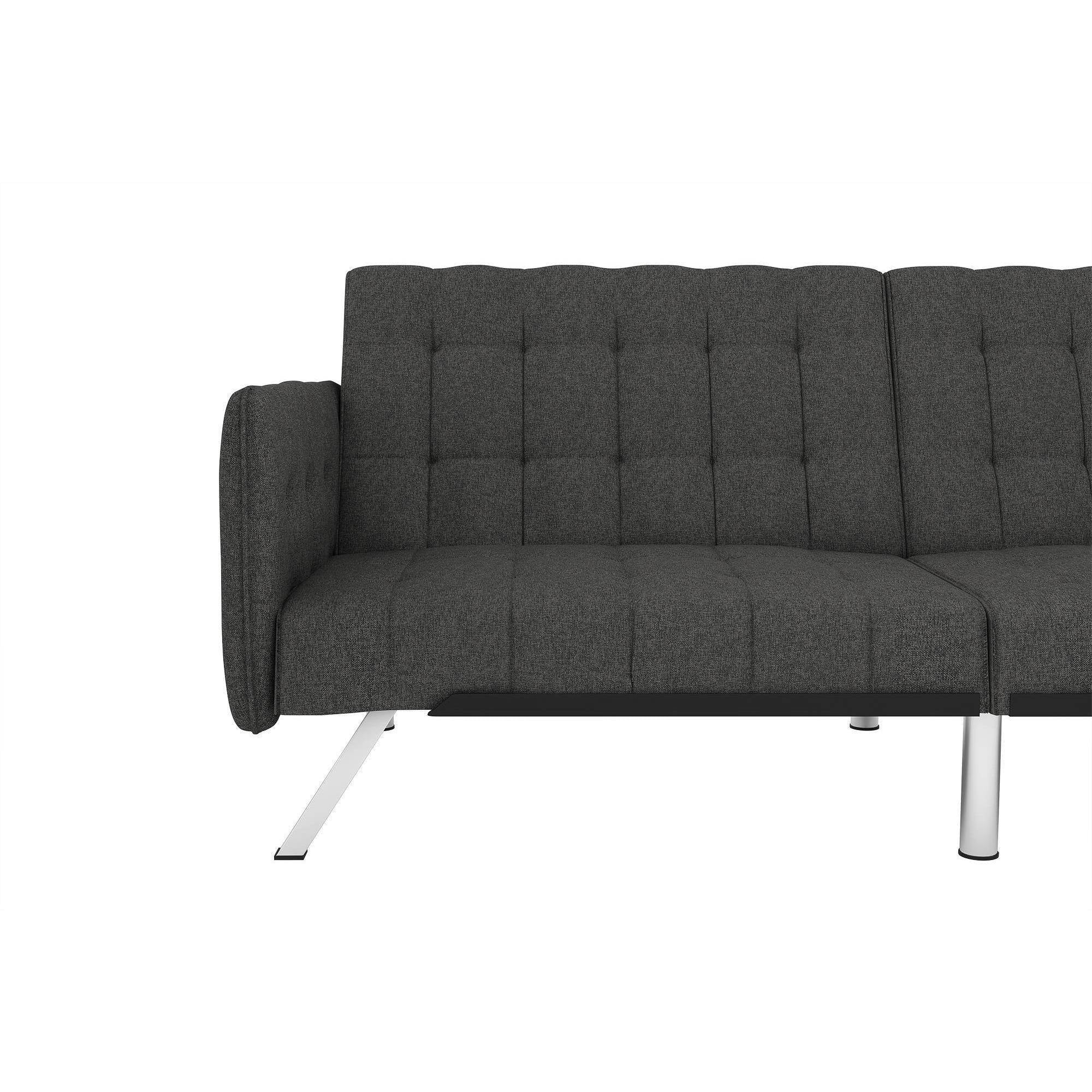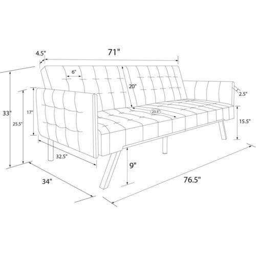 Dorel Home Emily Convertible SofaSleeper, Gray Linen Modern look and design in stylish linen or faux leather upholstery with chrome metal legs, tufted backrest and seating and wide side arms Multi-functional piece ideal for small living spaces. Split-back design allows for multiple positions: converts from sitting to lounging and sleeping Pair with the matching chair and chaise longer for a complete look (all sold separately) Ships in one box and assembles quickly. Wipes clean easily Sofa dimensions: 76.5″L x 34″W x 33″H. Sleeping dimensions: 71″L x 43.5″W x 15.5″H. Weight limit: 600 lb. Shipping dimensions: 45″L x 37″W x 16″H. Net weight: 88 lb. Shipping weight: 97 lb.