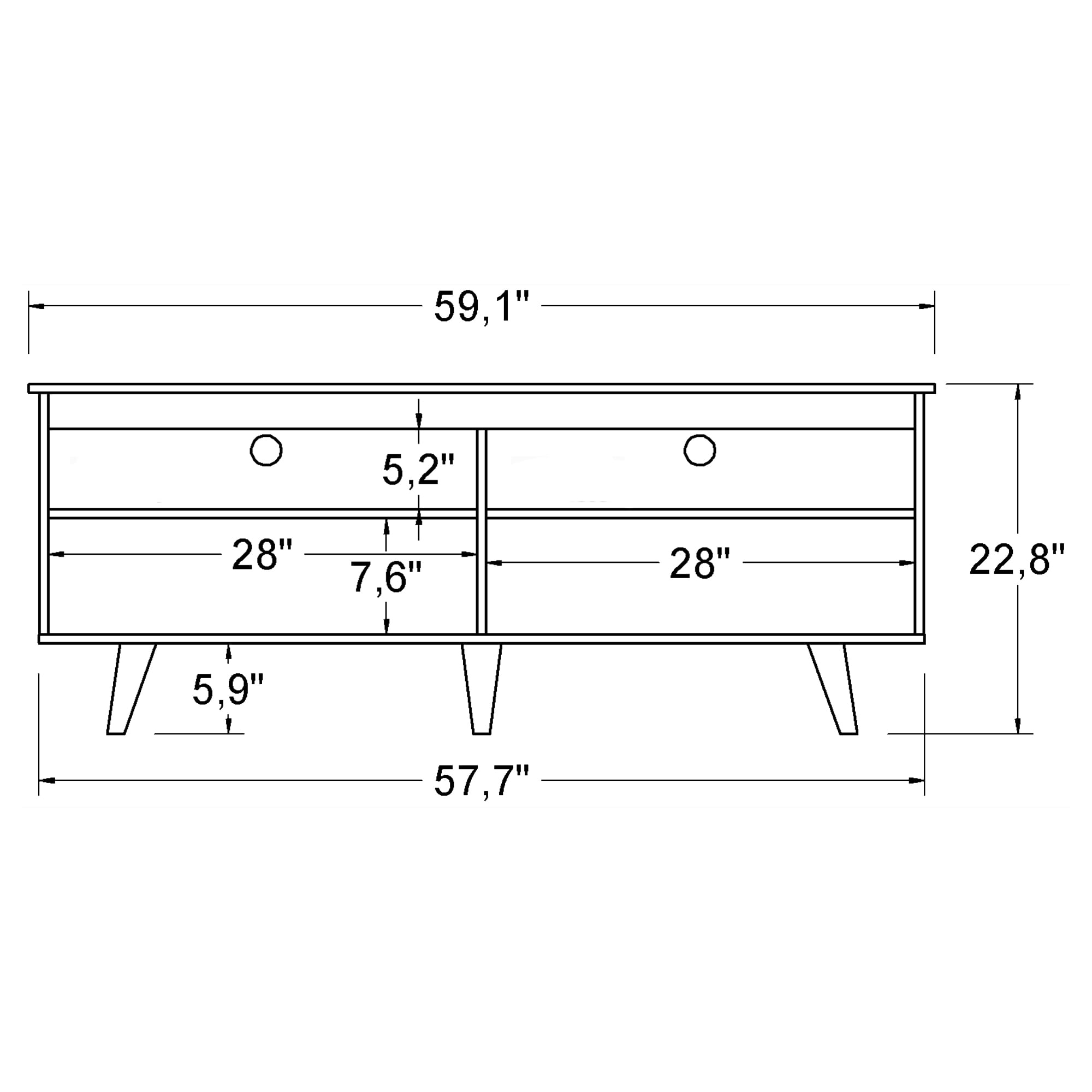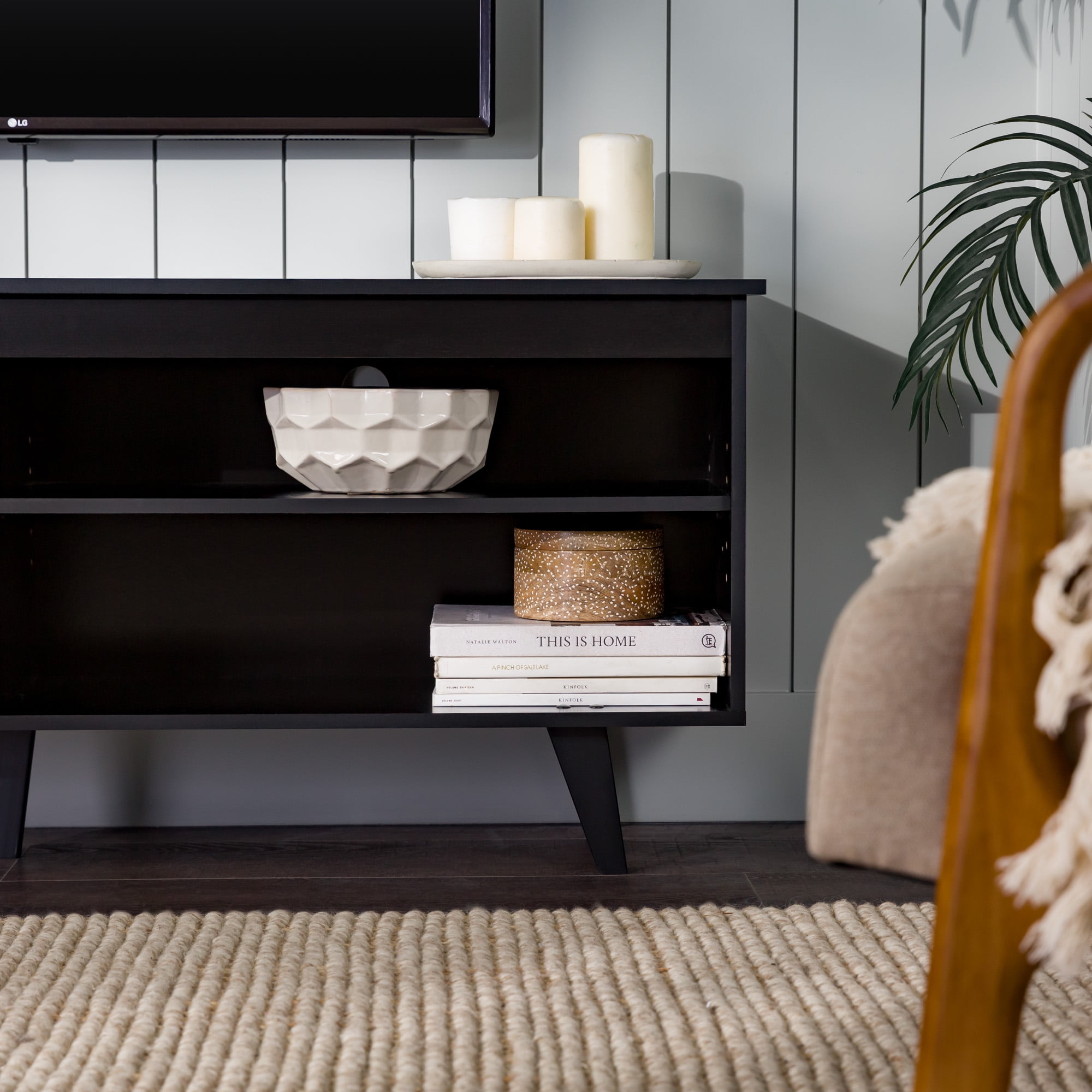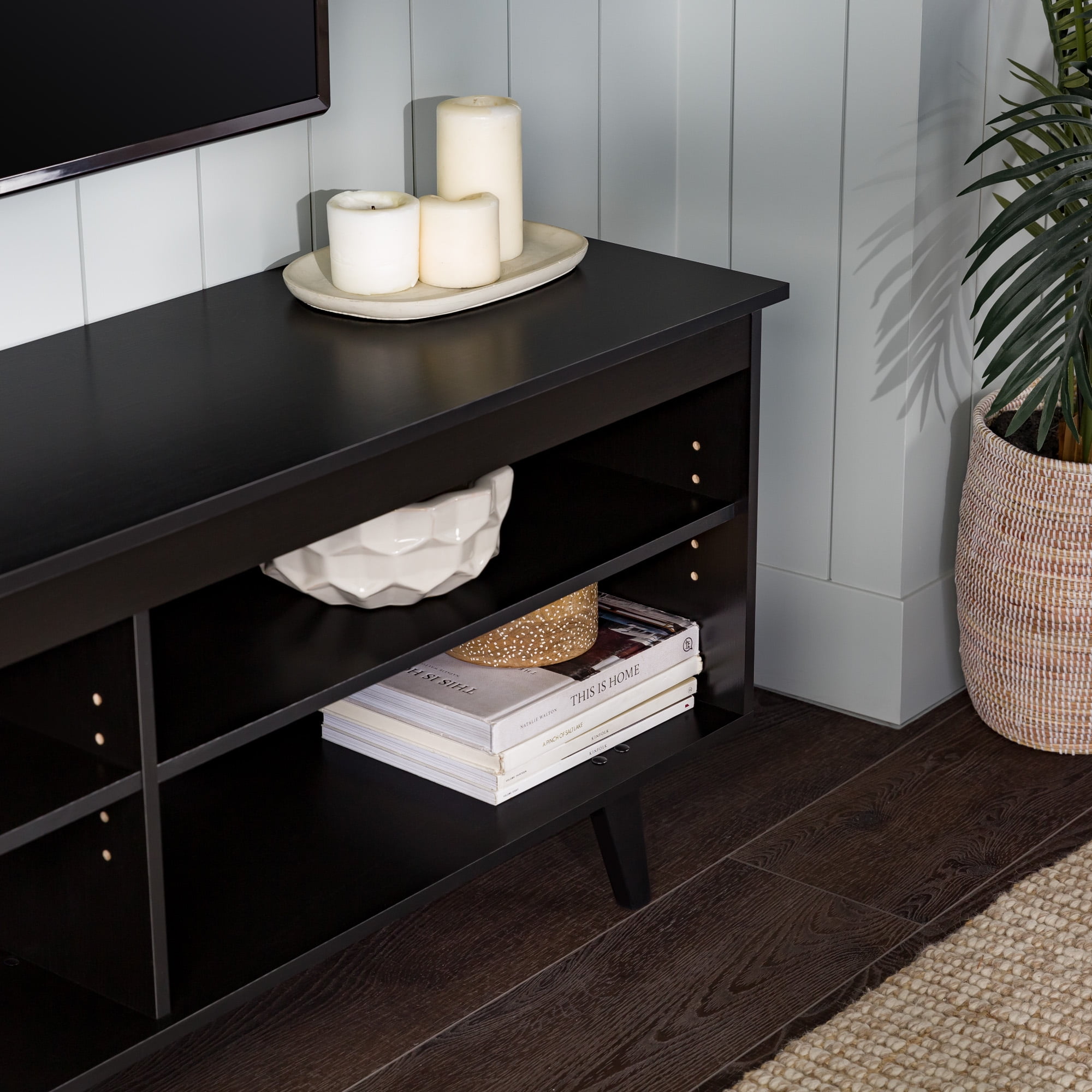 Bellamy Studios Selene Angled Leg TV Stand for TVs up to 60″, Painted: 59″ TV stand by Bellamy Studios Supports TVs up to 60″ Supports up to 250 lbs. Modern mid-century design with angled support legs for added aesthetic Offers 4 open storage shelves with cord management Can be utilized as a TV stand or as an entertainment center, buffet, or storage console Great for use in your living room, bedroom, home office, or dining room