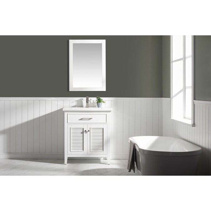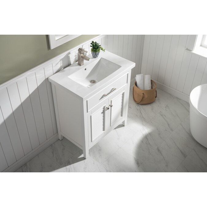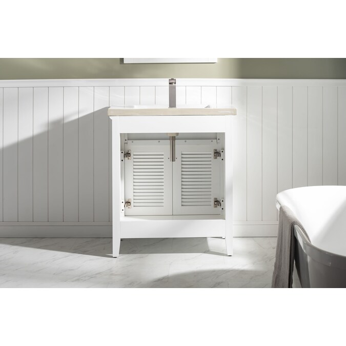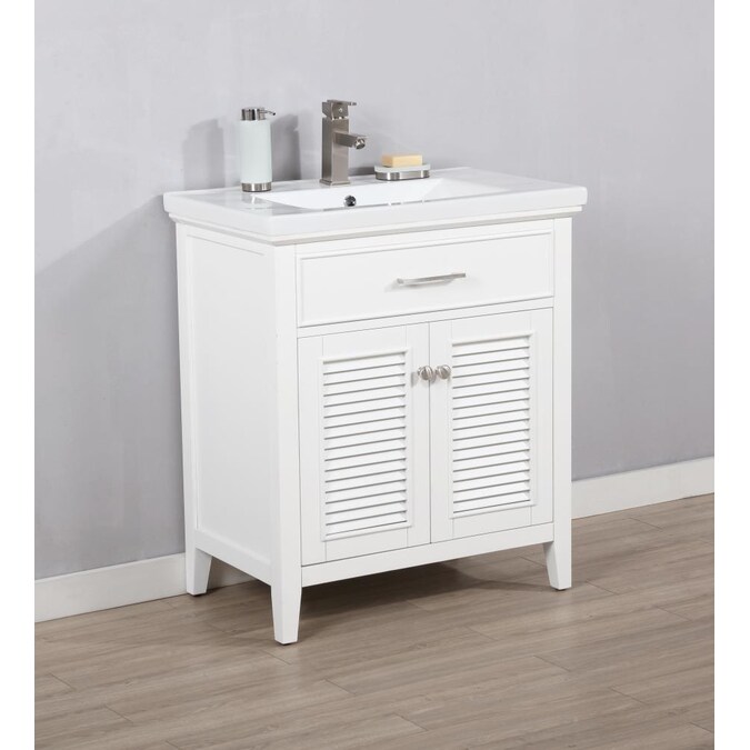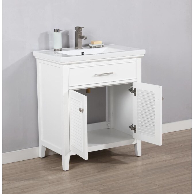 The Cameron 30” single sink vanity by Design Element provides the perfect finishing touch to your bathroom remodel project. Constructed of solid hardwood, this vanity will maintain its beauty and functionality year after year. The porcelain countertop and integrated sink with overflow perfectly matches the styling of the cabinet, and is extremely simple to maintain. Opening the 2 soft closed doors reveals an ample storage space. The included satin nickel hardware provides the perfect finishing touch to the white cabinet. Faucet and drain are not included.