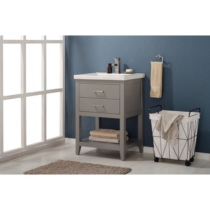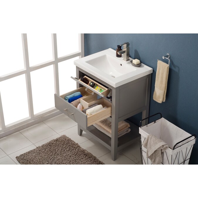 The Cara 24” single sink vanity by Design Element provides the perfect finishing touch to your bathroom remodel project. Constructed of solid hardwood, this vanity will maintain its beauty and functionality year after year. The porcelain countertop and integrated sink with overflow perfectly matches the styling of the cabinet, and is extremely simple to maintain. There is ample storage space for this vanity despite its small size. Hidden in the flip down drawer is a unique and useful storage box, and a second fully functional drawer constructed with dovetail joinery sits on soft close glides. There is also an open shelf at the base of the cabinet. The included brushed nickel hardware provides the perfect finishing touch to the gray cabinet. Faucet and drain are not included.
