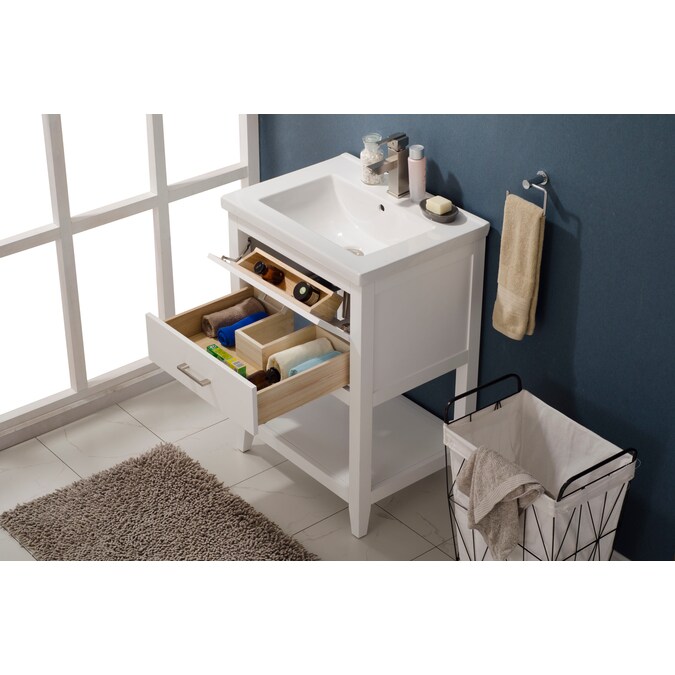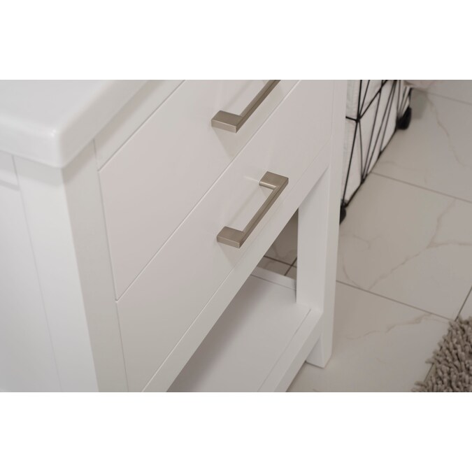 The Cara 24” single sink vanity by Design Element provides the perfect finishing touch to your bathroom remodel project. Constructed of solid hardwood, this vanity will maintain its beauty and functionality year after year. The porcelain countertop and integrated sink with overflow perfectly matches the styling of the cabinet, and is extremely simple to maintain. There is ample storage space for this vanity despite its small size. Hidden in the flip down drawer is a unique and useful storage box, and a second fully functional drawer constructed with dovetail joinery sits on soft close glides. There is also an open shelf at the base of the cabinet. The included brushed nickel hardware provides the perfect finishing touch to the white cabinet. Faucet and drain are not included.