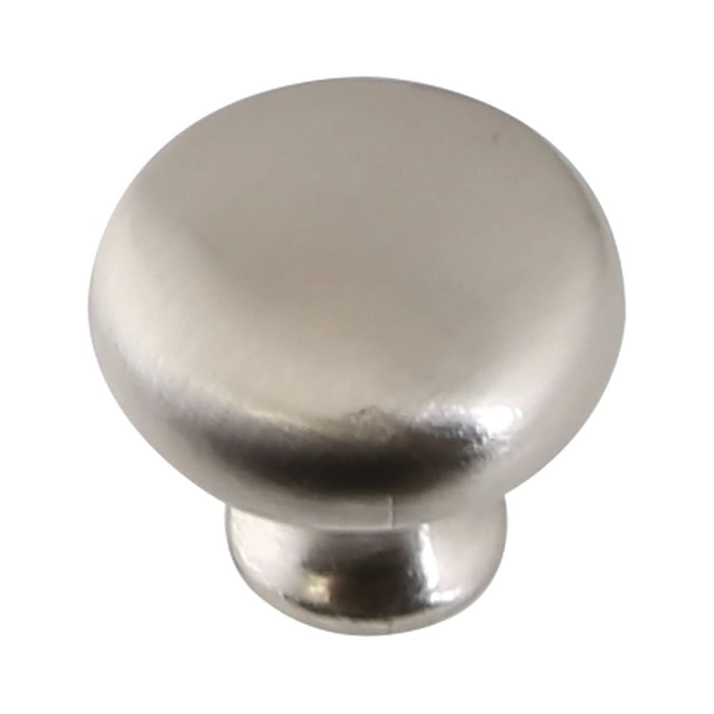 Classic knob hardware in a pack of twenty-five, ideal for all cabinet types and décor styles Crafted of zinc with a satin nickel finish 1.11-inch knob diameter; 1.04-inch projection from wall Mounting hardware included 1-Year limited warranty