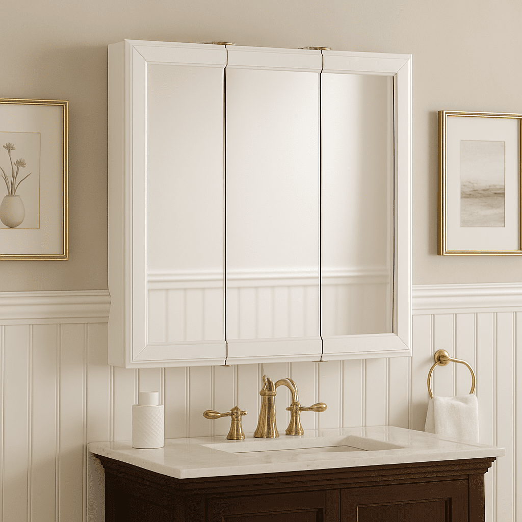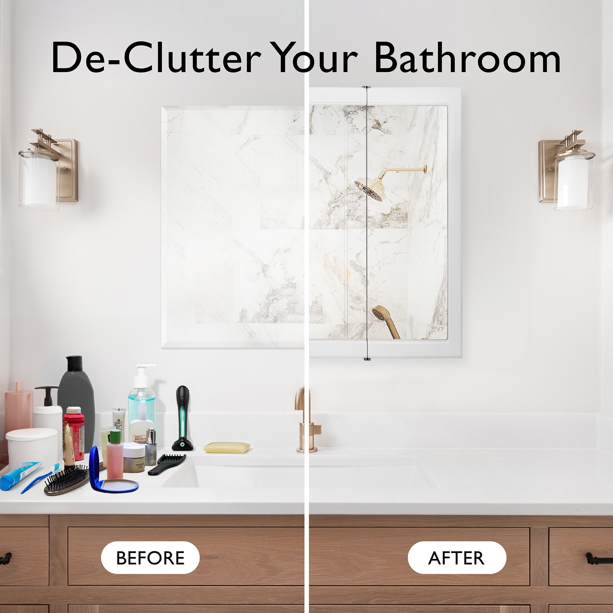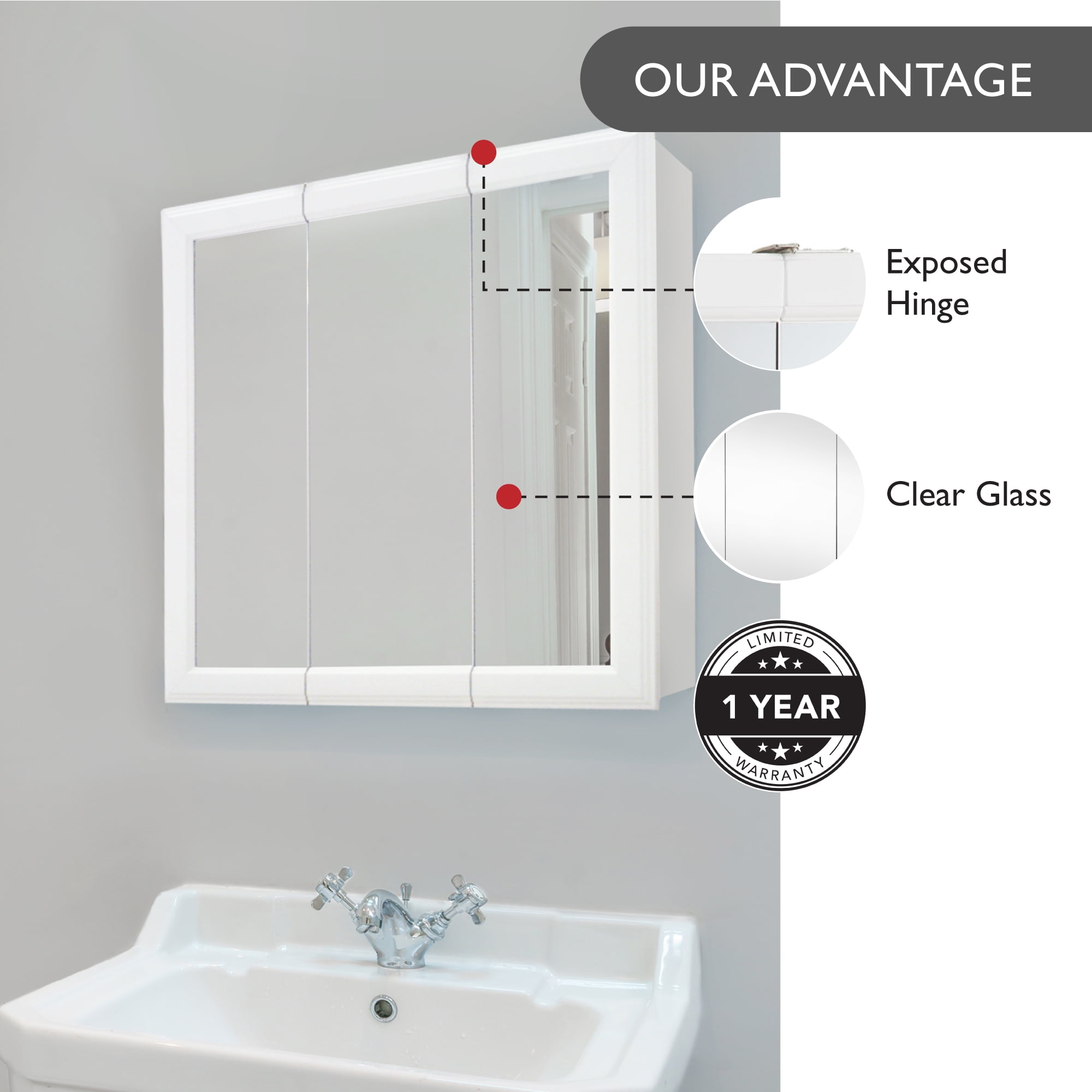 Medicine Cabinet Dimensions: Bathroom Cabinet measures 30 inches W x 4.5 inches D x 24 inches H with 3 mirrored doors and 2 adjustable shelves Modern and Elegant Design: Classic white finish frame with 3 mirrored doors for numerous viewing angles will match most style bathrooms Avoid Bathroom Clutter: Offering extra storage for your bathroom, this cabinet can hold all your essentials including hair products, toothbrushes, medicine, makeup, and other necessities to help avoid clutter on your counter for convenient easy access Improved Packaging: Product ships fully assembled in improved packaging to ensure a safe and secure delivery without damages Buy with Confidence: Customer satisfaction has been our priority for 150 years; this mirror comes with a 1-year limited warranty so you can rest assured your purchase is risk-free