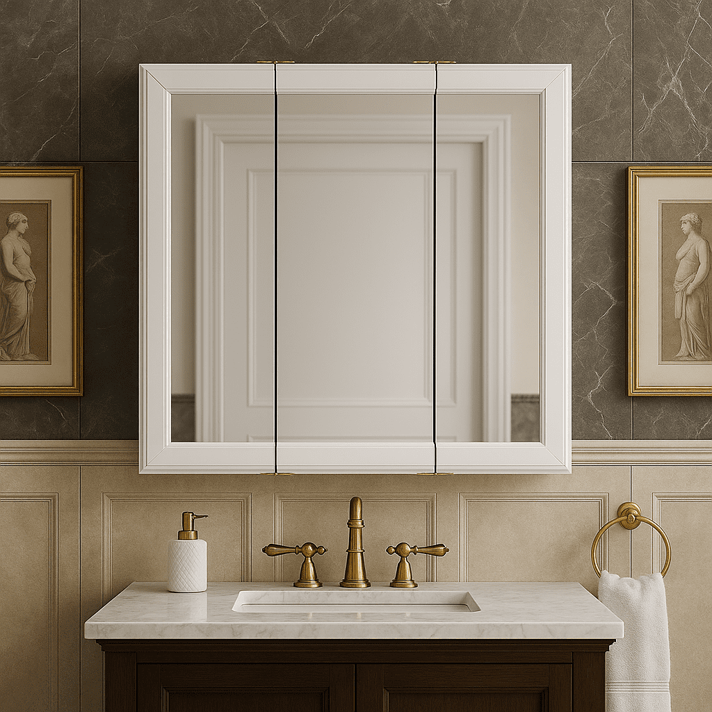 The Design House Classic medicine cabinet has 3 mirrored doors with a white frame finish. This medicine cabinet features two adjustable shelves, providing convenient storage for items such as hair products, toothbrushes, medication, cosmetics, and essential supplies, helping you maintain a clutter-free countertop. It arrives at your doorstep fully assembled, packaged with extra care to guarantee a safe and intact delivery. To ensure suitability for various settings, this cabinet is designed to meet the requirements for use in damp environments. Designed and manufactured by Design House, the trusted source for quality lighting, hardware, plumbing, kitchen, and bath products for every taste and budget.