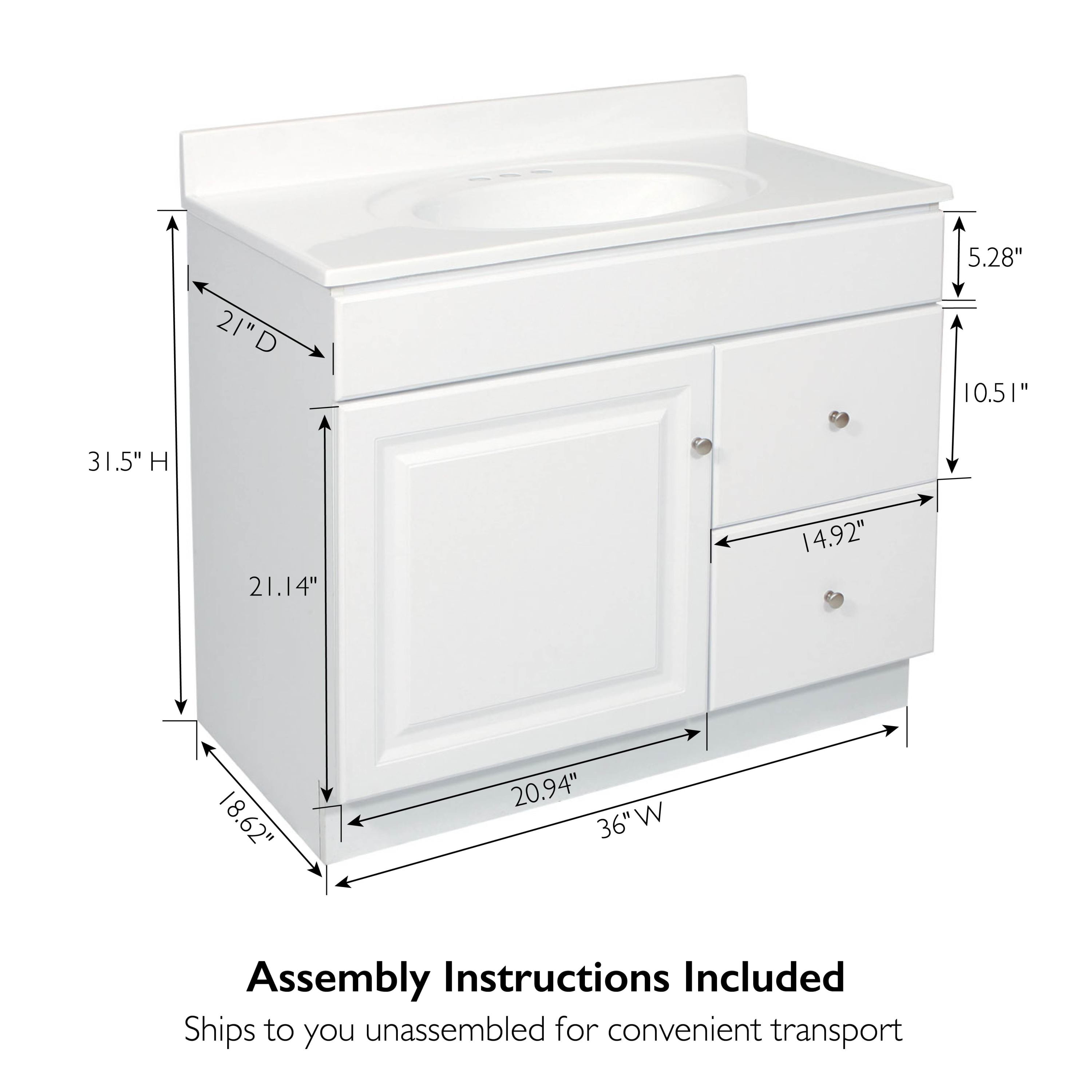 Functional Construction: Frameless design promotes increased storage space and accessibility for toiletries to keep your countertop free of clutter Ample Storage Space: 2 drawers and 1 door conceal generous interior space, perfect for keeping your countertop free of clutter and storing toiletries, cleaning supplies, and more Classic Design: Raised paneling and satin nickel knobs blend seamlessly with a variety of decor styles; vanity top not included so you have the freedom to choose a 37-inch by 22-inch engineered or natural stone vanity top that suits your style Ready to Assemble: Ships to your home flat in protected packaging and ready to assemble with hardware included; step-by-step instructions and labeled parts make assembly clear and straightforward Buy with Confidence: Customer satisfaction has been the priority for our Wisconsin-based company for more than 150 years; with our 1-year limited warranty, you can rest assured your purchase is risk-free
