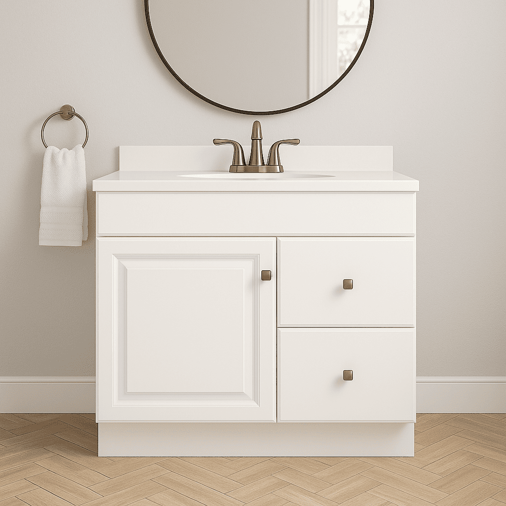 The Design House Wyndham 36-Inch Bathroom Vanity offers timeless style and practical storage, making it a perfect addition to any traditional or classic bathroom. Constructed for longevity and reliable performance even in humid bathroom environments. The frameless design provides a sleek, timeless look while maximizing storage space, featuring a 1-door, 2-drawer configuration with raised panel fronts and satin nickel knobs for easy access to toiletries, cleaning supplies, and more. The open back design allows for easy plumbing access and accommodates unique configurations, while the vanity sits flush to the floor with a built-in toe kick for a seamless look and effortless cleaning. Designed to fit compact spaces, the doors and drawers open fully even when placed close to walls. This vanity does not include a countertop, allowing you to customize it with a 37-inch by 22-inch engineered or natural stone top to suit your style. Shipped flat-packed with labeled hardware and step-by-step instructions, assembly is clear and straightforward. Backed by a 1-year limited warranty, the Wyndham vanity provides an affordable and stylish storage solution for your bathroom.