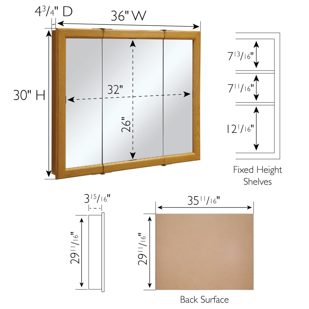 Measures 36 inches W x 4.75 inches D x 30 inches H Features a honey oak finish with a water resistant seal (3) doors and (2) stationary shelves Comes fully assembled and ready for installation 1-year limited warranty Product ships in improved packaging to ensure a safe and secure delivery without damage