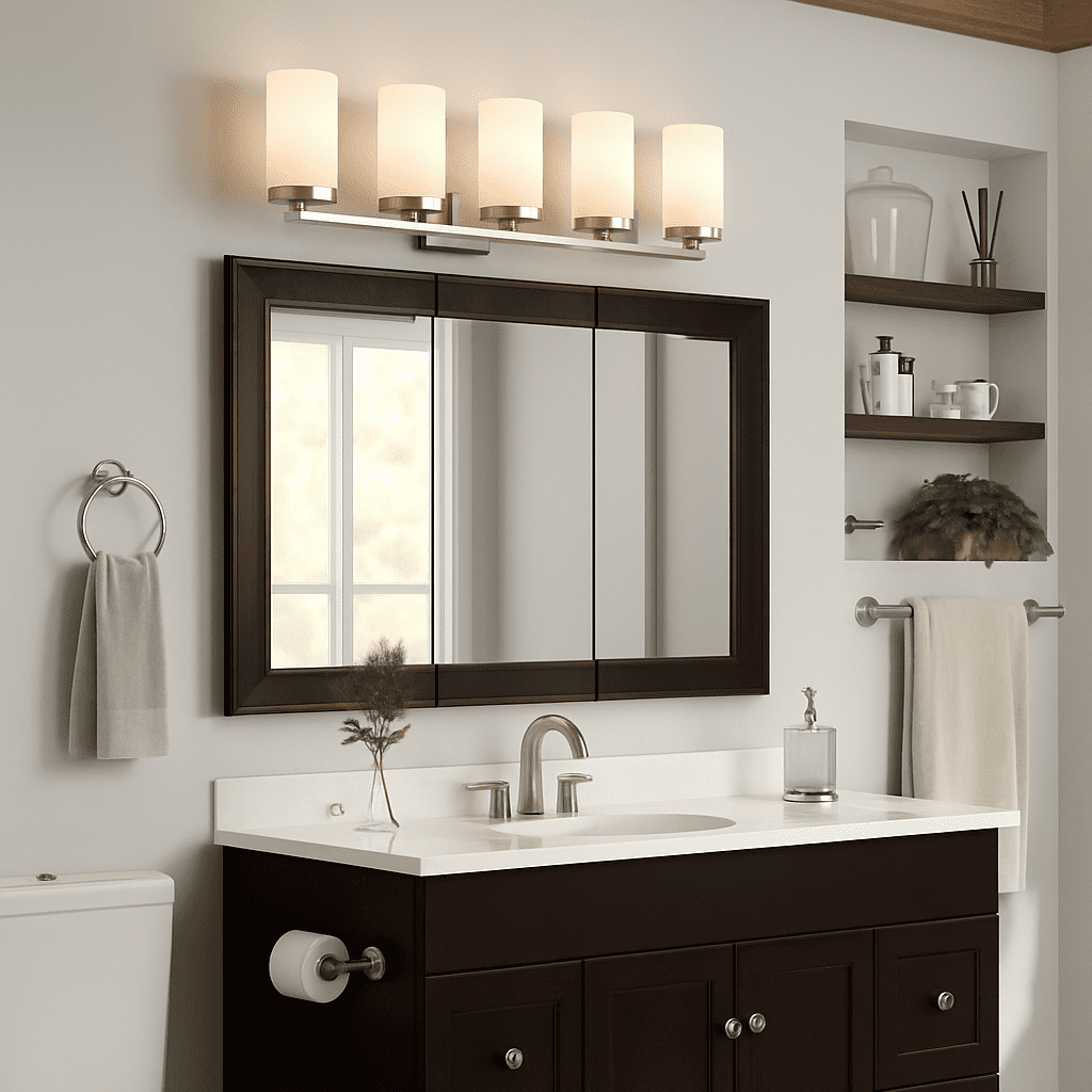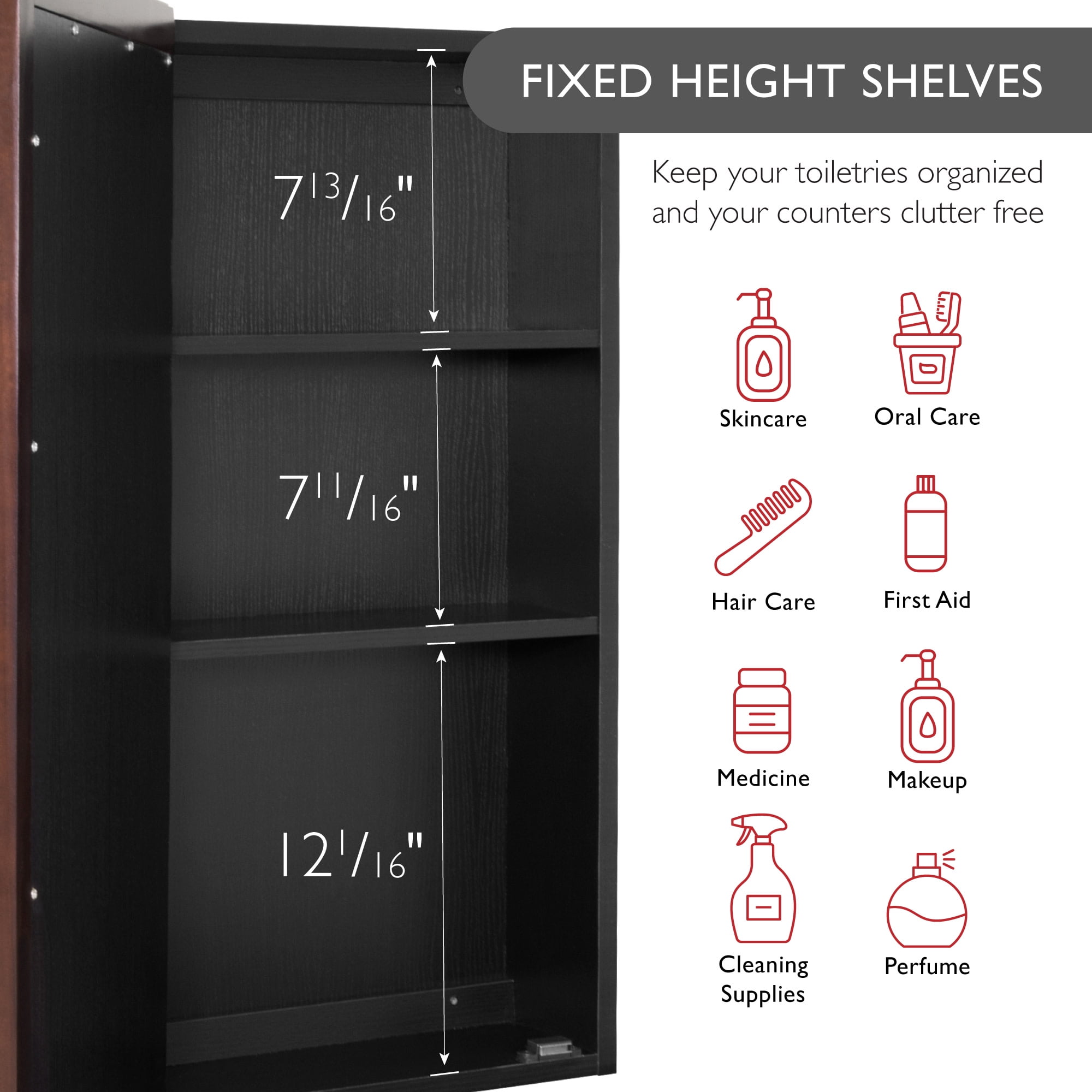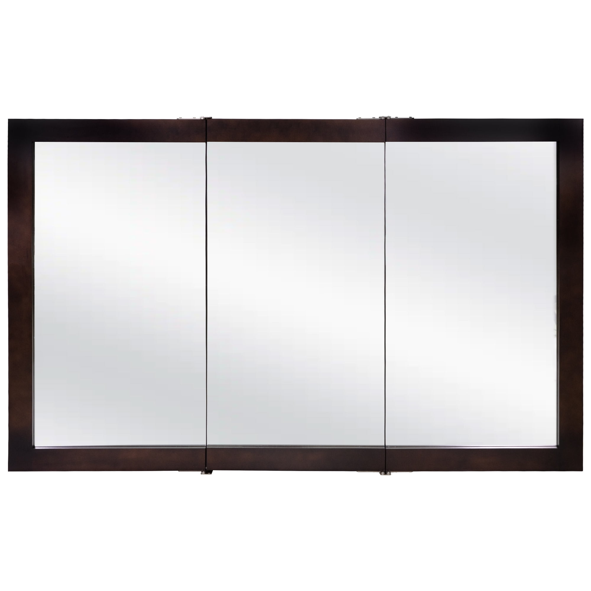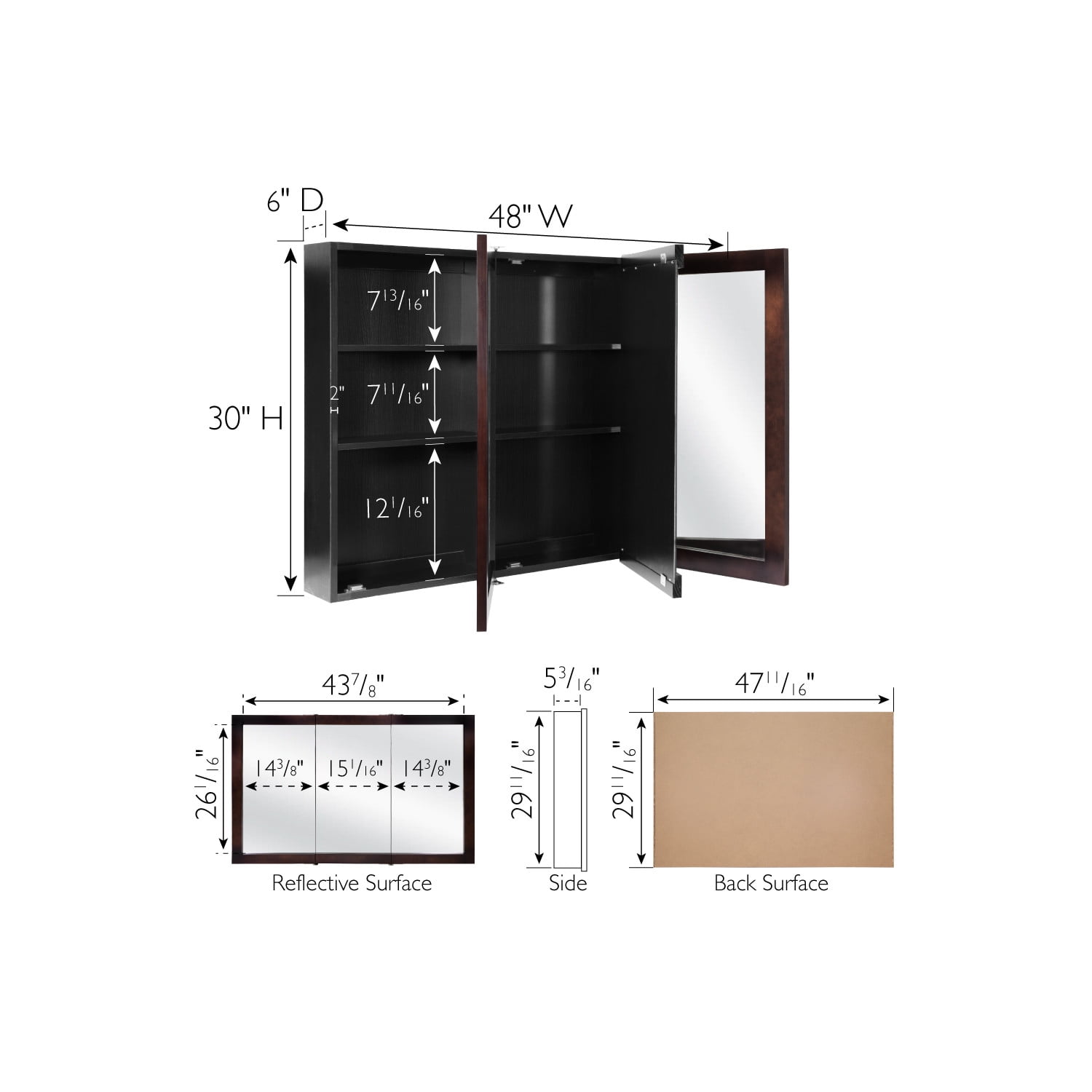 This bathroom medicine cabinet with mirror measures 48 inches W x 6 inches D x 30 inches H with 3 mirrored doors and 2 stationary shelves Modern and Elegant Design: This bathroom cabinet wall mount features a classic espresso finish frame with 3 mirrored doors for numerous viewing angles will match most style bathrooms Avoid Bathroom Clutter: Offering extra storage for your bathroom, medicine cabinets for bathroom can hold all your essentials including hair products, toothbrushes, medicine, makeup, and other necessities to help avoid clutter on your counter for convenient easy access The Mirror cabinet ships fully assembled and ready for installation Product ships in improved packaging to ensure a safe and secure delivery without damage