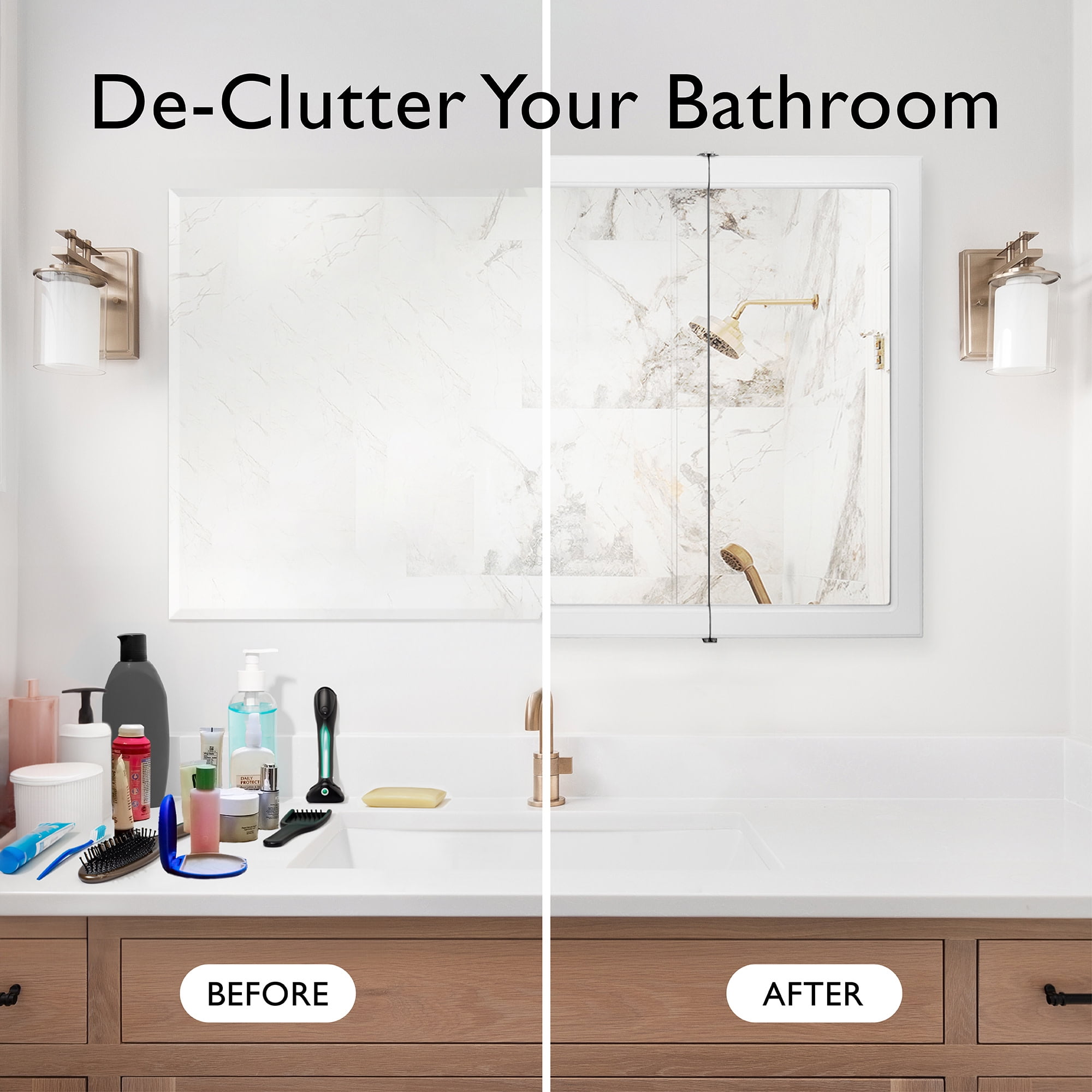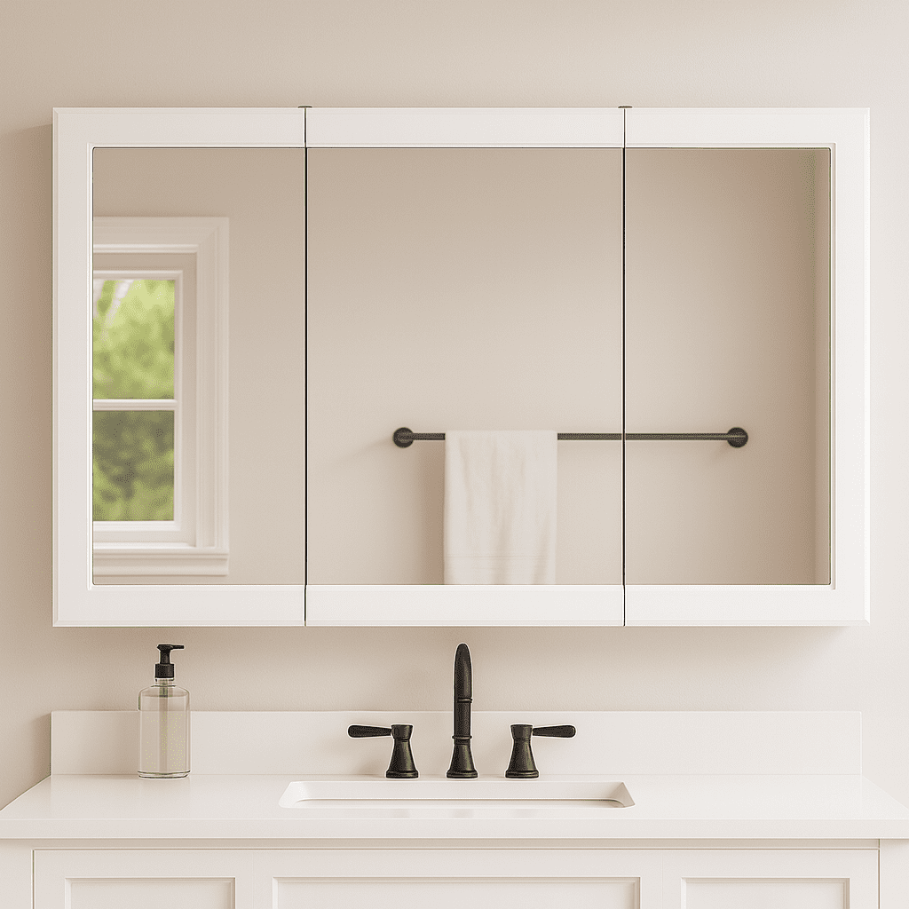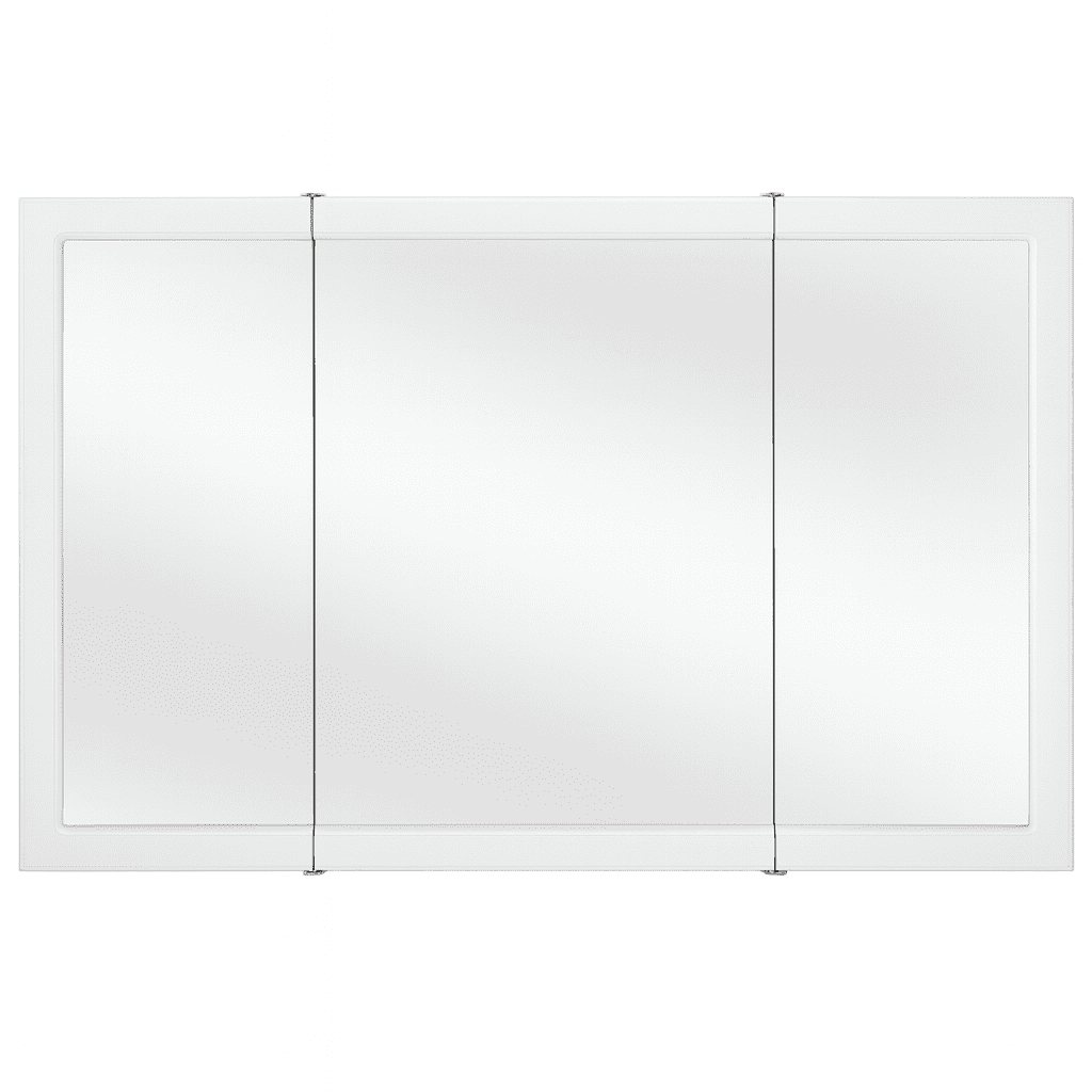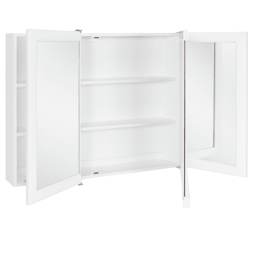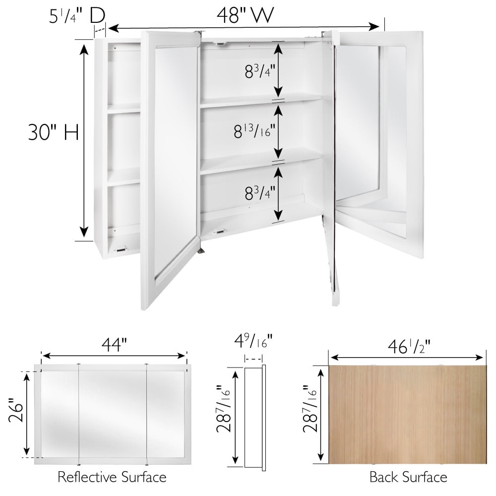 Medicine Cabinet Dimensions: Bathroom Cabinet measures 48 inches W x 5.25 inches D x 30 inches H with 3 mirrored doors and 2 stationary shelves Modern and Elegant Design: Classic white finish frame with 3 mirrored doors for numerous viewing angles will match most style bathrooms Avoid Bathroom Clutter: Offering extra storage for your bathroom, this cabinet can hold all your essentials including hair products, toothbrushes, medicine, makeup, and other necessities to help avoid clutter on your counter for convenient easy access Improved Packaging: Product ships fully assembled in improved packaging to ensure a safe and secure delivery without damages Buy with Confidence: Customer satisfaction has been our priority for 150 years; this mirror comes with a 1-year limited warranty so you can rest assured your purchase is risk-free