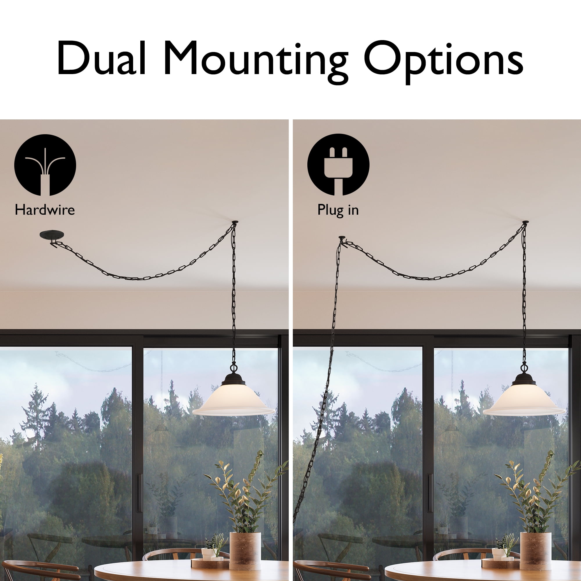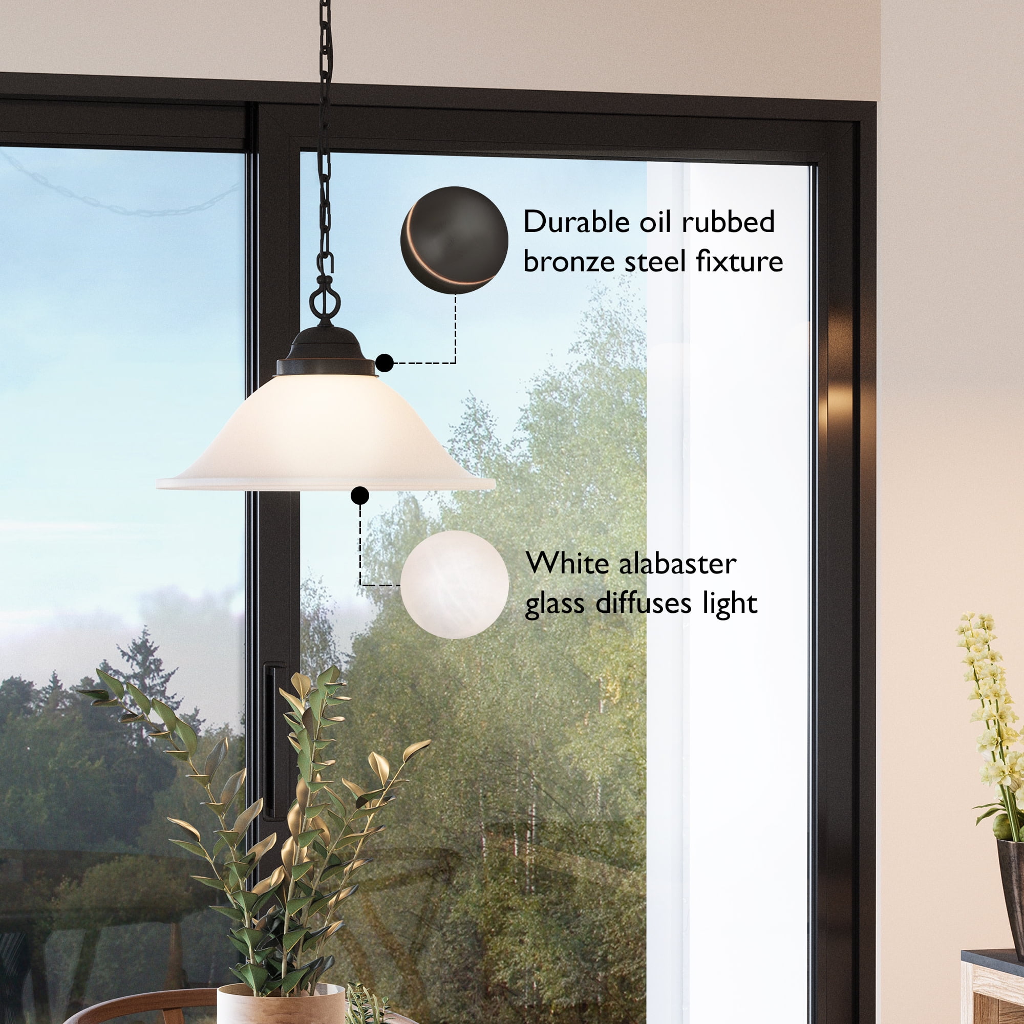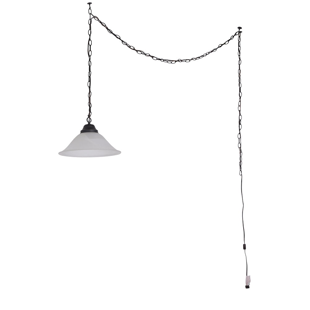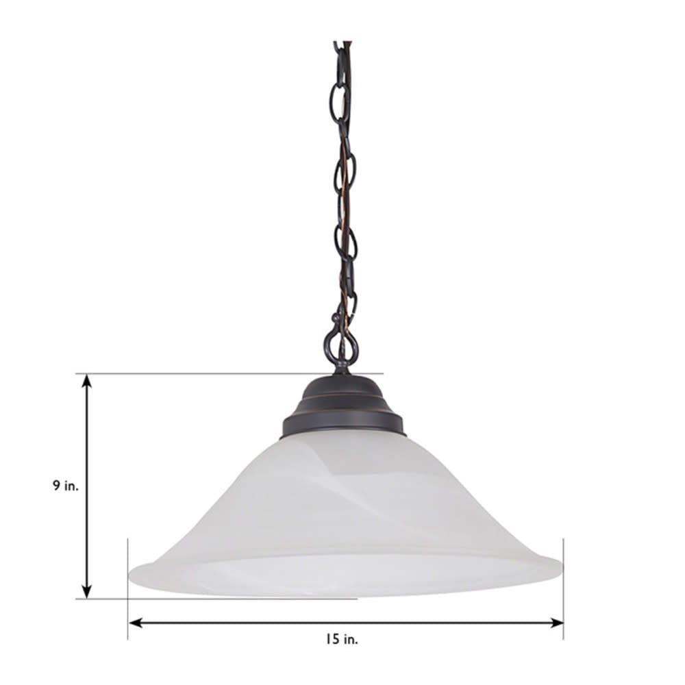 Classic Design: Oil rubbed bronze finish with an alabaster glass shade enhances kitchens, dining rooms, and living spaces with warm, inviting lighting Easy and Flexible Installation: Includes an 18-foot chain and 20-foot cord for hardwired or plug-in setup, with a ceiling canopy and two hooks for swag mounting, everything you need for a quick installation Bulb Requirements: Requires one 100-watt medium base E26 bulb or LED equivalent (not included); on/off switch located on the cord for convenience Dimmable Lighting: Fully dimmable when used with a compatible dimmer switch (not included), allowing for adjustable brightness Buy with Confidence: Customer satisfaction has been the priority for our Wisconsin-based company for more than 150 years; with our 10-year limited warranty you can rest assured your purchase is risk-free