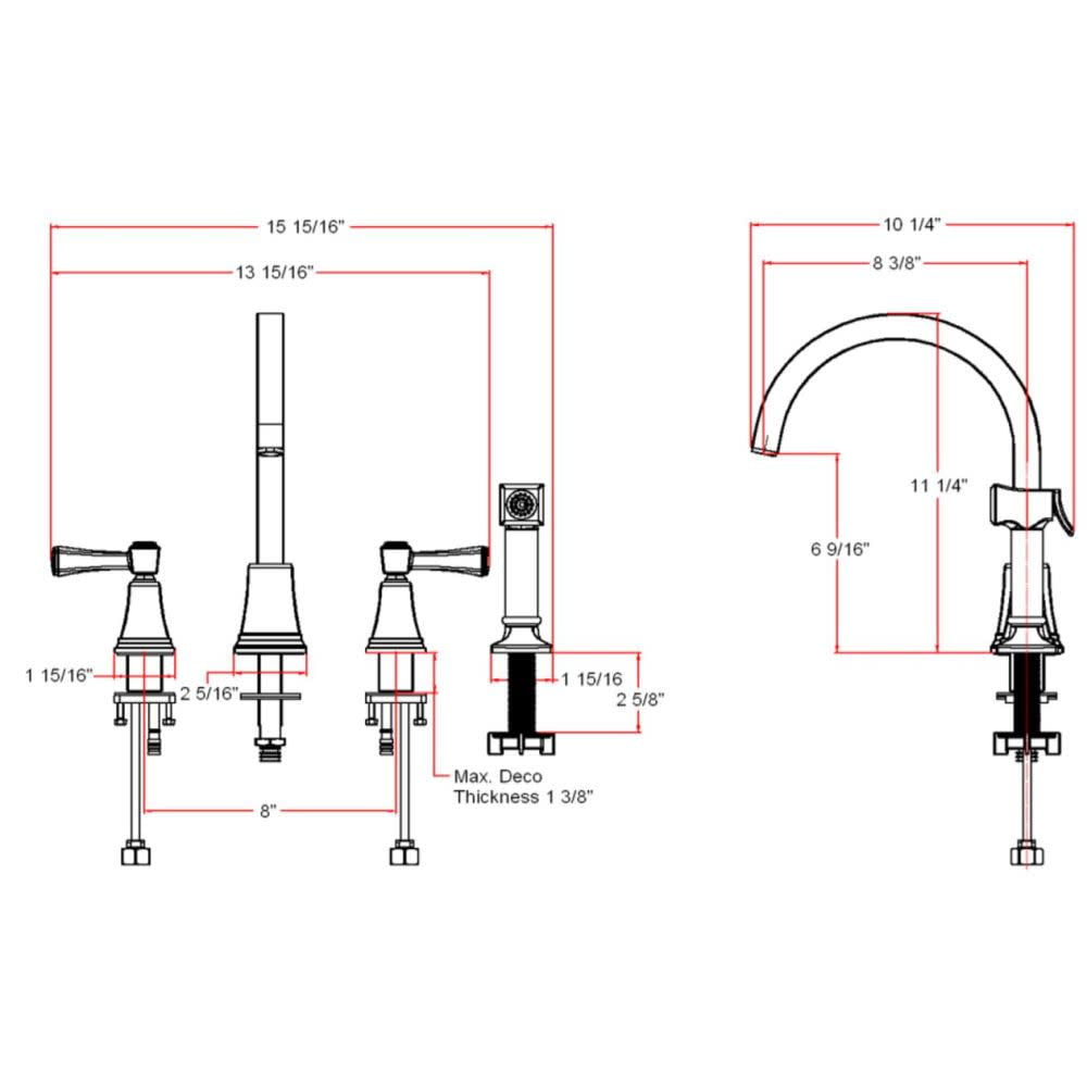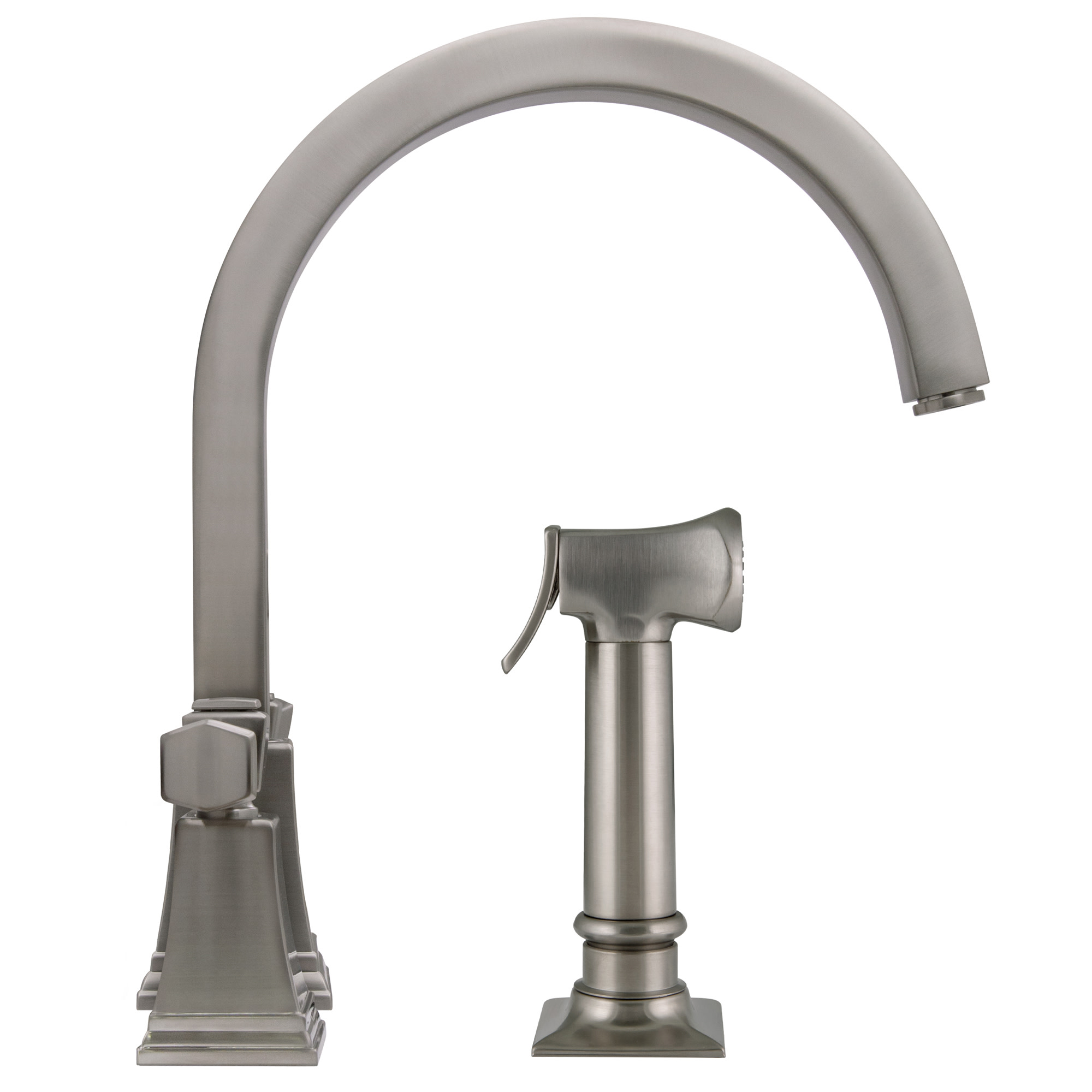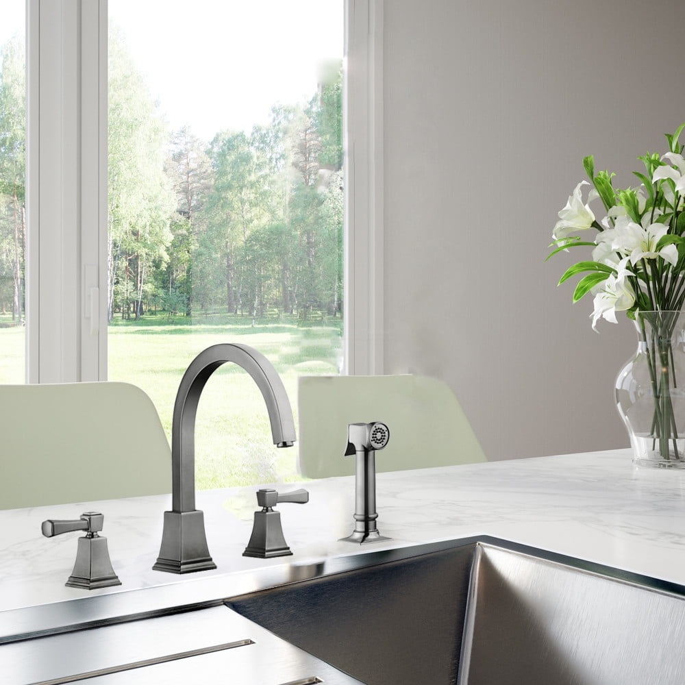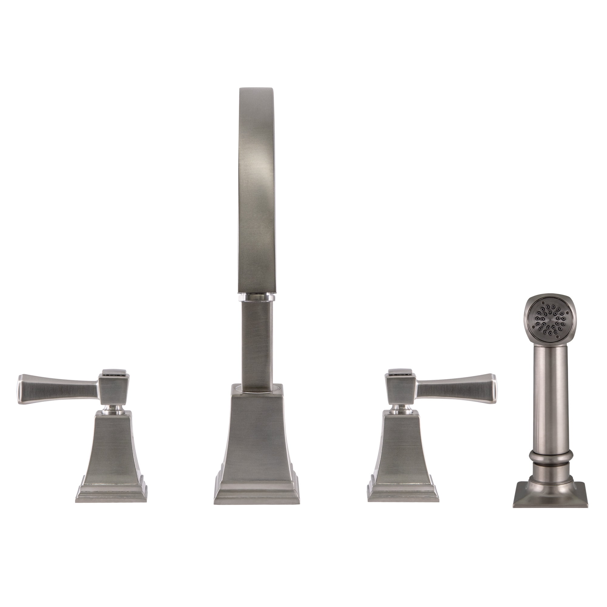 Dual handle design to easily adjust the water temperature, finished in satin nickel with a classic look 4 hole mount for faucet, 2 handles and side sprayer 1.8-gallon per minute flow rate ensures a steady water flow after years of everyday use Matching side sprayer includes 48-inches of soft hose which can reach and eliminate baked on residue in hard to reach areas Durable ceramic cartridge contains wear-resistant ceramic plates to prevent corrosion from water flow Brass waterways to ensure safe and clean water for your family Faucet is ADA compliant, cUPC certified and AB-1953 5-Year limited warranty/Lifetime finish warranty