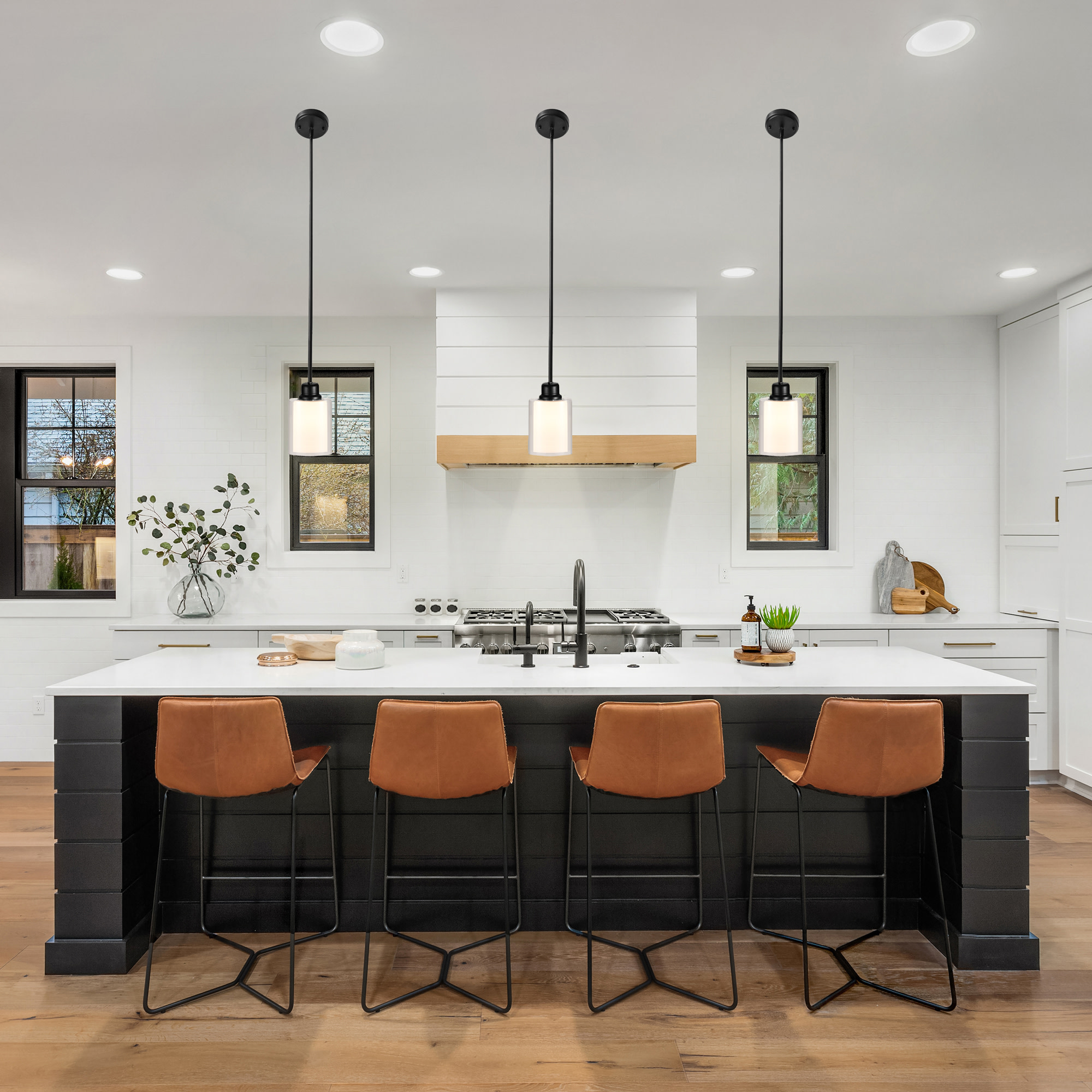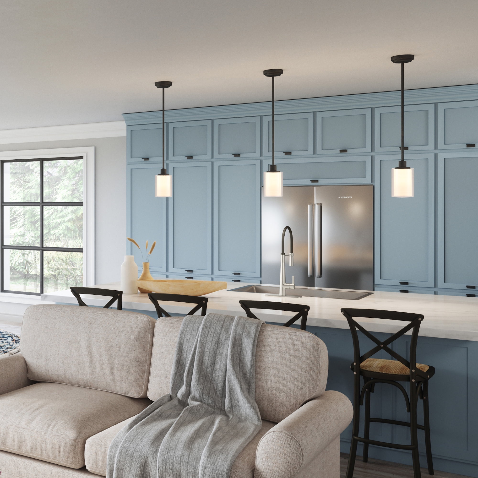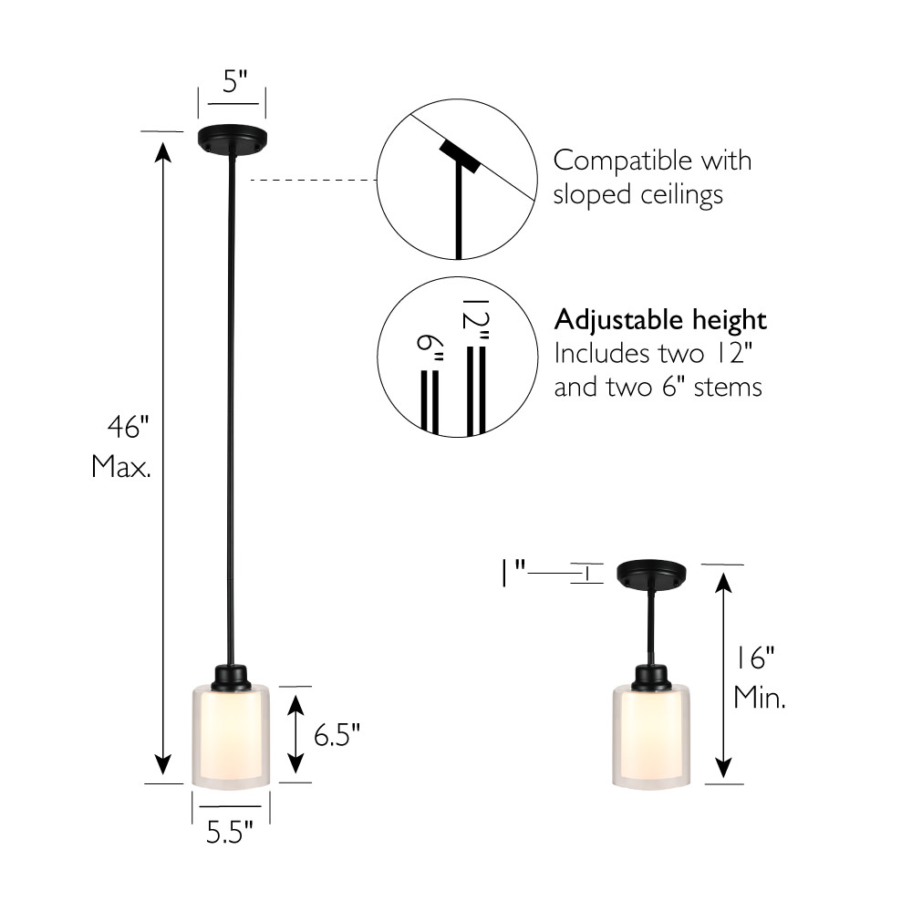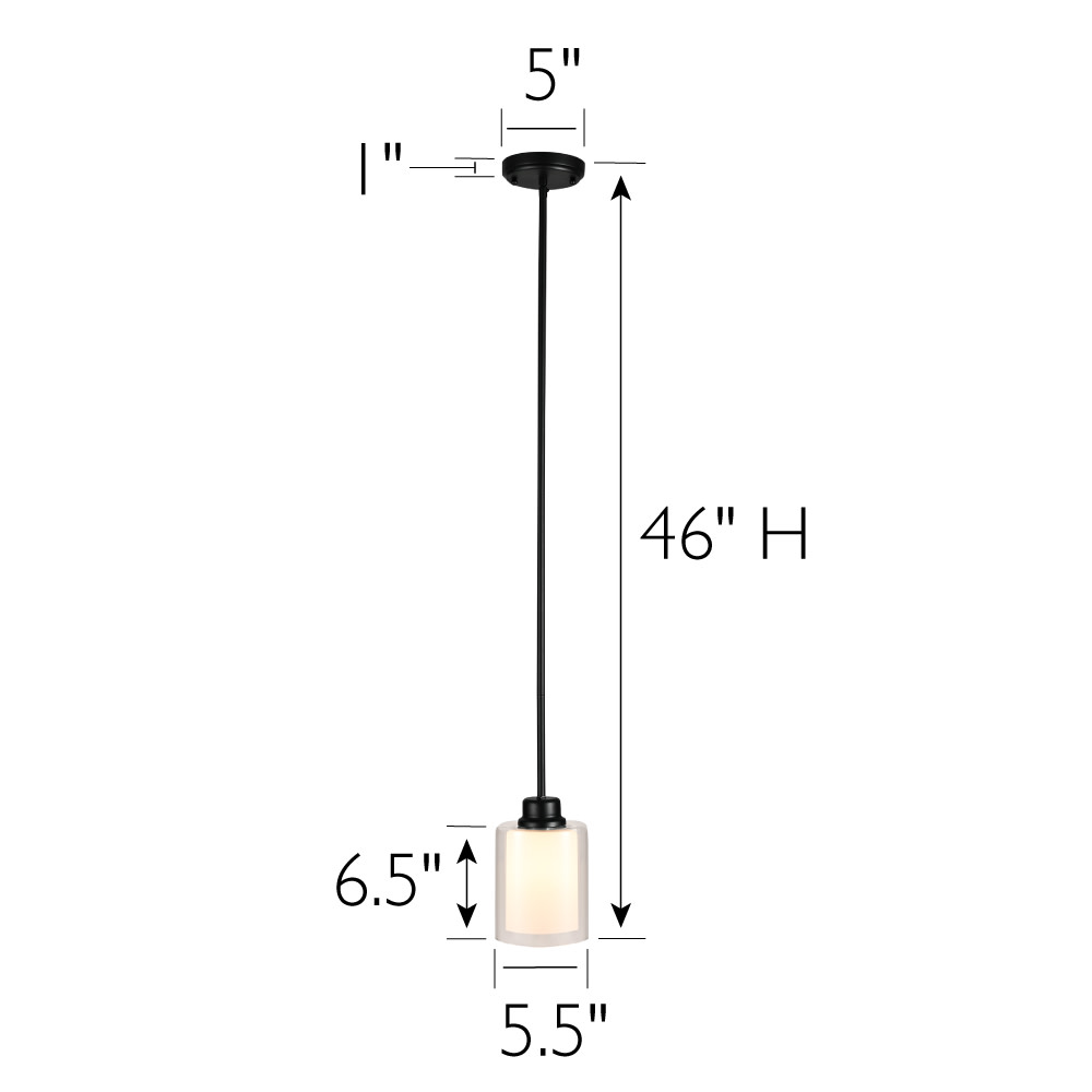 The Design House 567214-BLK Oslo mini pendant light is ideal for bringing a modern style and light to your dining room, kitchen island, entryway or any open area. With an exterior clear glass and interior white glass, the dual cylinder shades add both illumination and sophistication to your home. This model is made of formed steel with a clear outer glass and white inner glass shades for a transitional touch. For use with (1) 60 watt, medium base bulbs (rated at 120-volts) or LED equivalent (not included). Clear outer glass: 6.5 in. H x 5.5 in. diameter. White inner glass 6 in. H x 4 in. DIA. For indoor, ceiling mount applications, this model is easy to install and makes a charming first impression. Designed and manufactured by Design House, the trusted source for quality lighting, hardware, plumbing, kitchen, and bath products for every taste and budget.cETL/ETL listed. Comes with a 10-Year limited warranty.