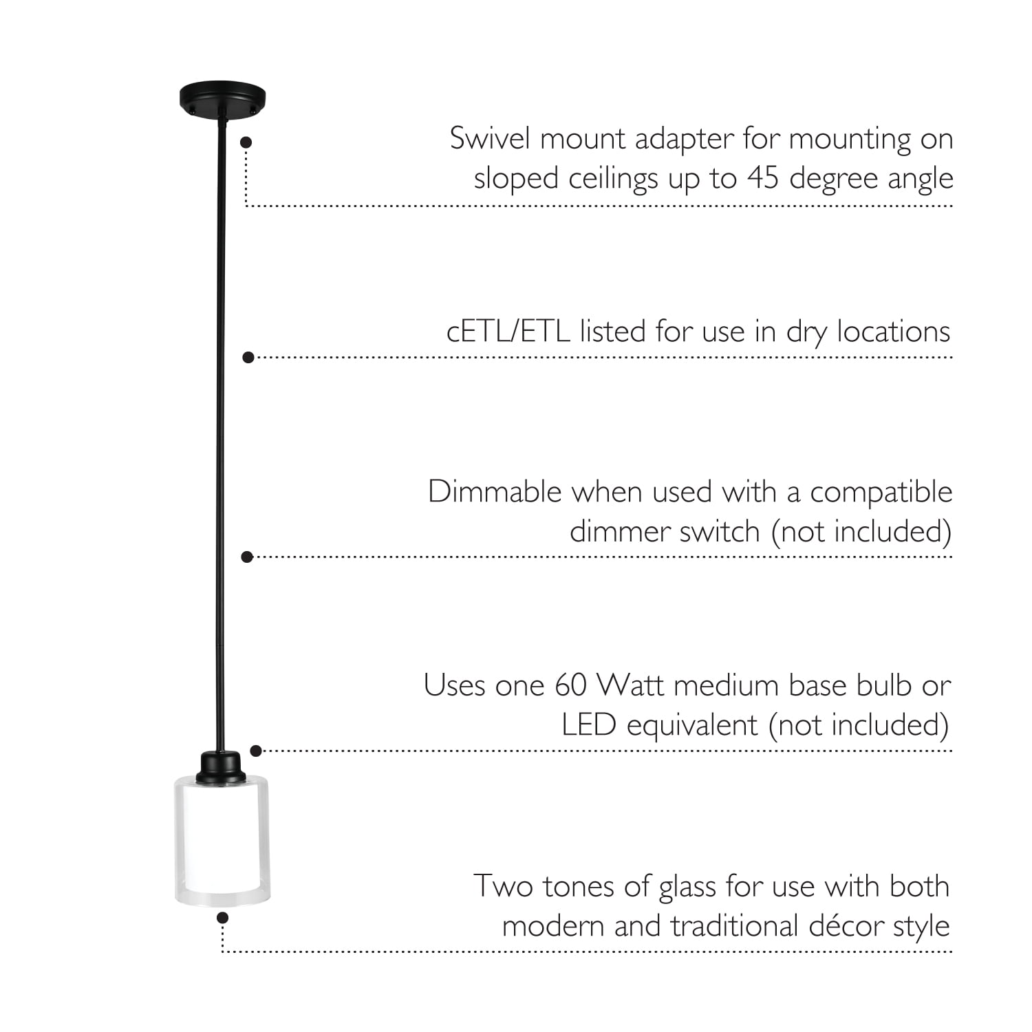 Features clear outer glass with white inner glass to create a unique look that coordinates well with both modern and traditional decor styles Crafted of formed steel with a matte black finish Made for use with dimming switches (not included) Cylindrical light shade provides a soft diffusion of light Fixture measures 46 in. H x 5.5 in. L x 5.5 in. D Buy with Confidence: Customer satisfaction has been our priority for 150 years; with our 10-year limited warranty, you can rest assured your purchase is risk-free