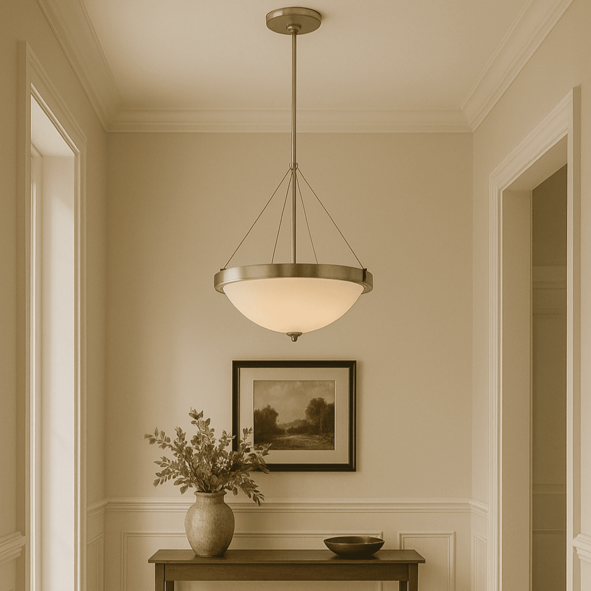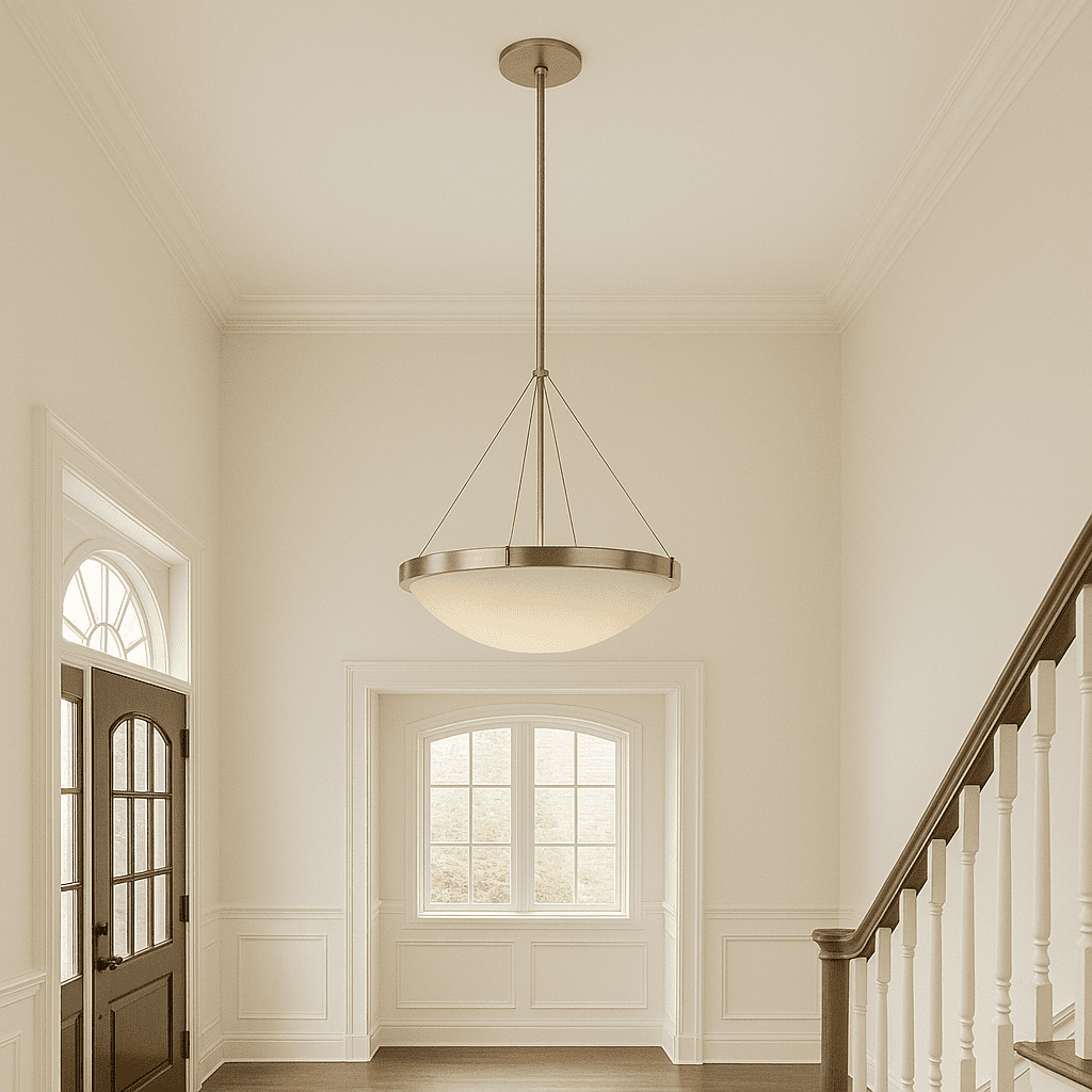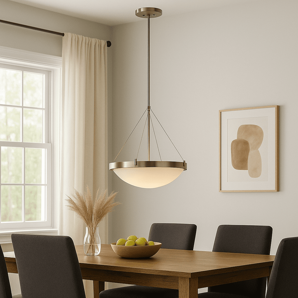 IDEAL FOR entryway, kitchens, dining rooms, foyer, cafes, dens and more, this transitional, bowl-shaped pendant has a modern satin nickel finish with a frosted white glass shade DIMENSIONS: 52 in. H x 20 in. W Uses (3) 60 Watt Incandescent Medium base bulbs or LED equivalent (Not included) DIMMABLE: Designed to be dimmable when used with a compatible dimmer switch (not included); allowing you to adjust the preferred light brightness UL listed for use in Dry locations 10-Year limited warranty
