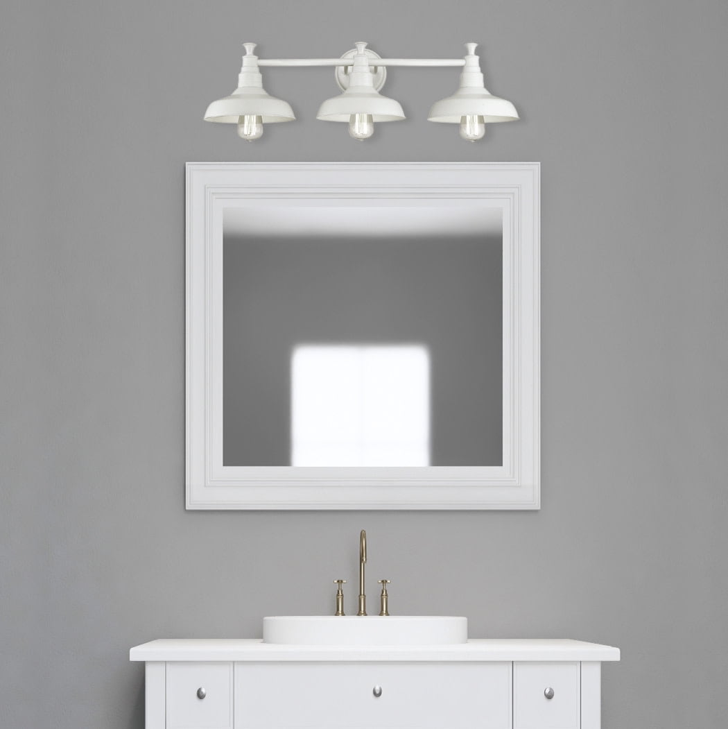 IDEAL FOR bathrooms, this rustic industrial wall light has an antique white finish with a bell-shaped metal shade DIMENSIONS: 11 in. H x 31.18 in. L x 9 in. W Uses (3) 60 Watt Medium base bulbs or LED equivalent (Not included) DIMMABLE: Designed to be dimmable when used with a compatible dimmer switch (not included); allowing you to adjust the preferred light brightness This product is cETL/ETL certified for use in damp Locations and comes with a 10-year limited warranty10-year limited warranty Sturdy and Durable: Steel construction for long-lasting use; this product is cETL/ETL certified for use in damp locations